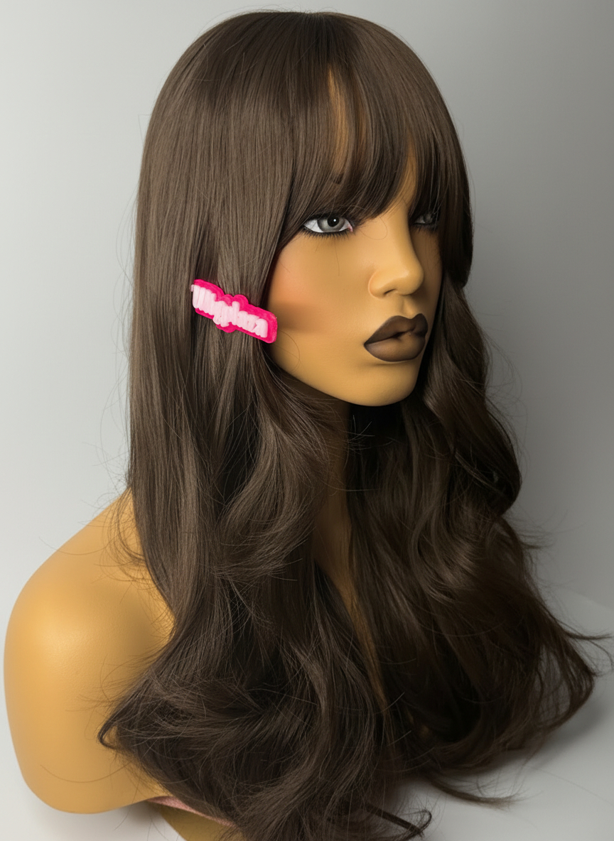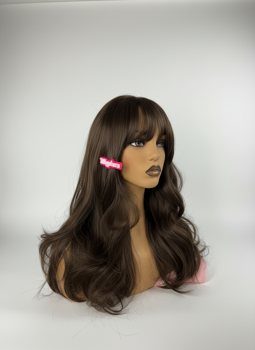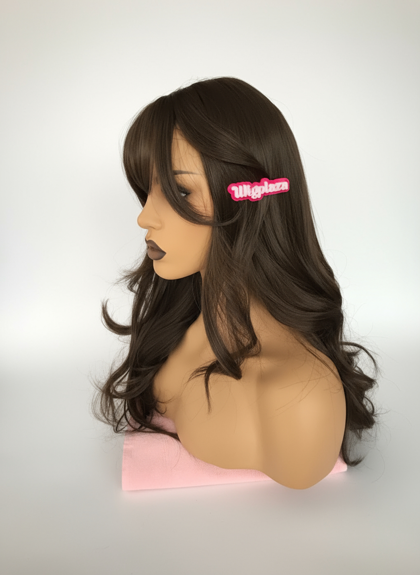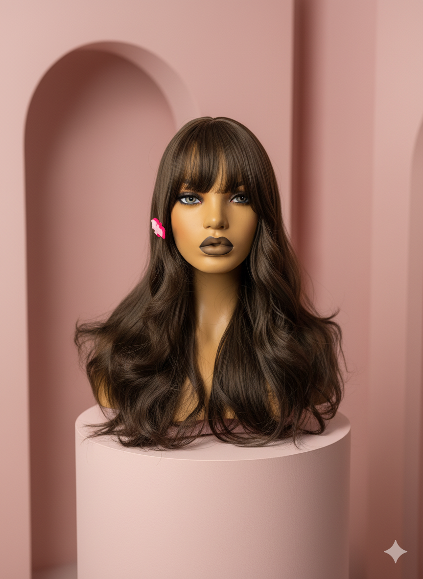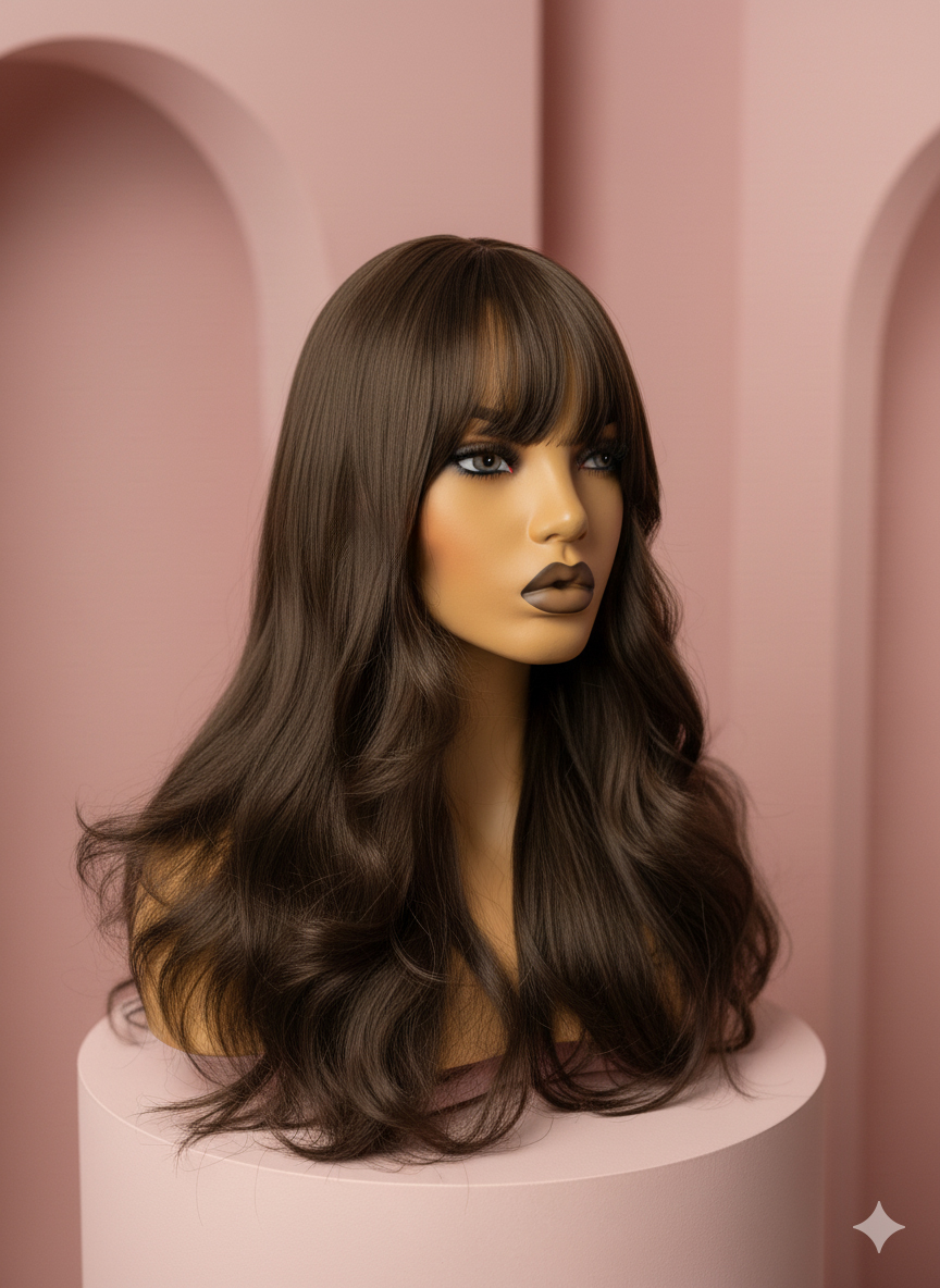 Brązowa peruka z grzywką w odcieniu czekoladowego brązu. Matowa, miękka i naturalna w dotyku. Prosta od nasady, a niżej przechodzi w lekkie fale, które dodają objętości i ruchu. Delikatnie cieniowana grzywka pięknie podkreśla oczy i rysy twarzy.
