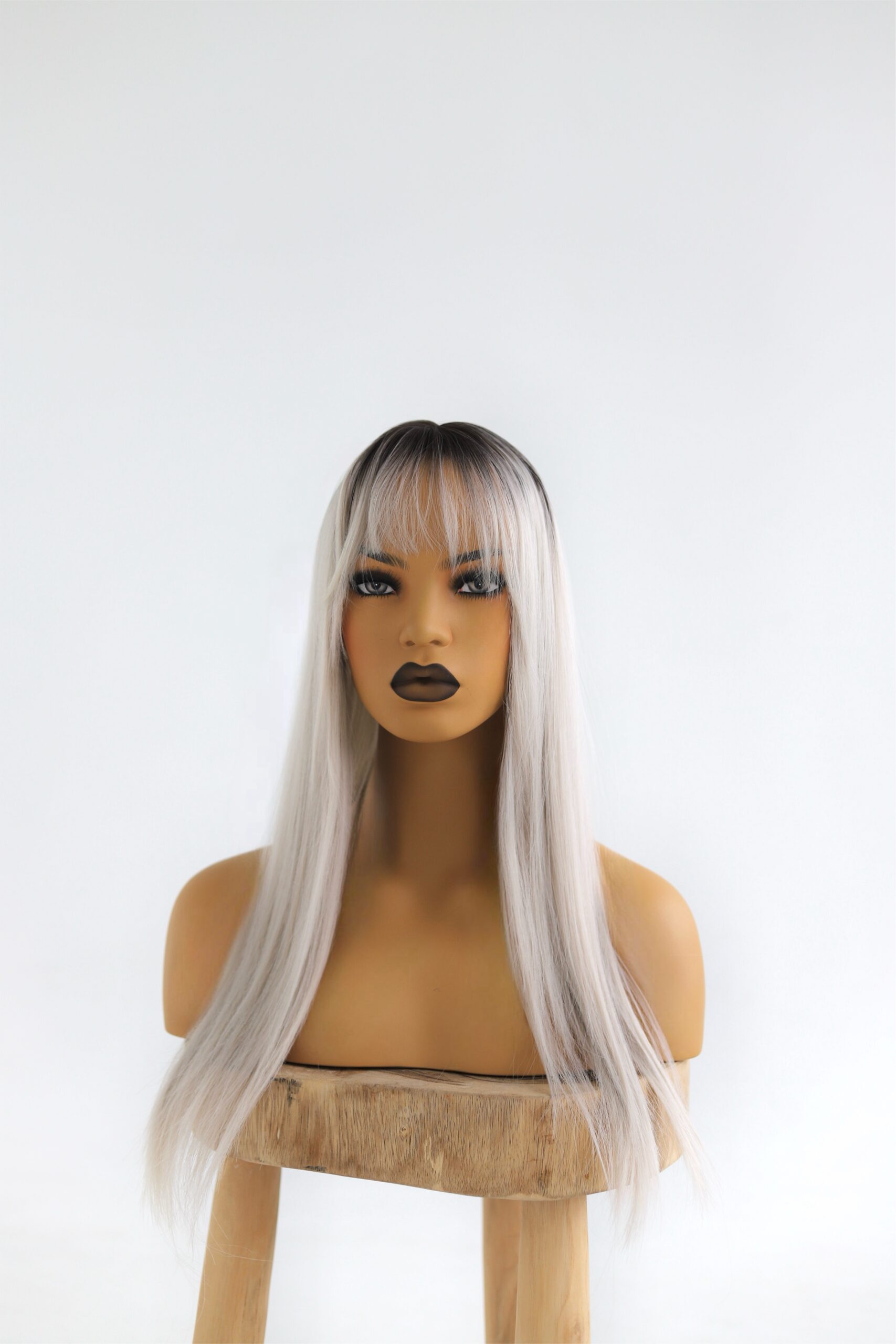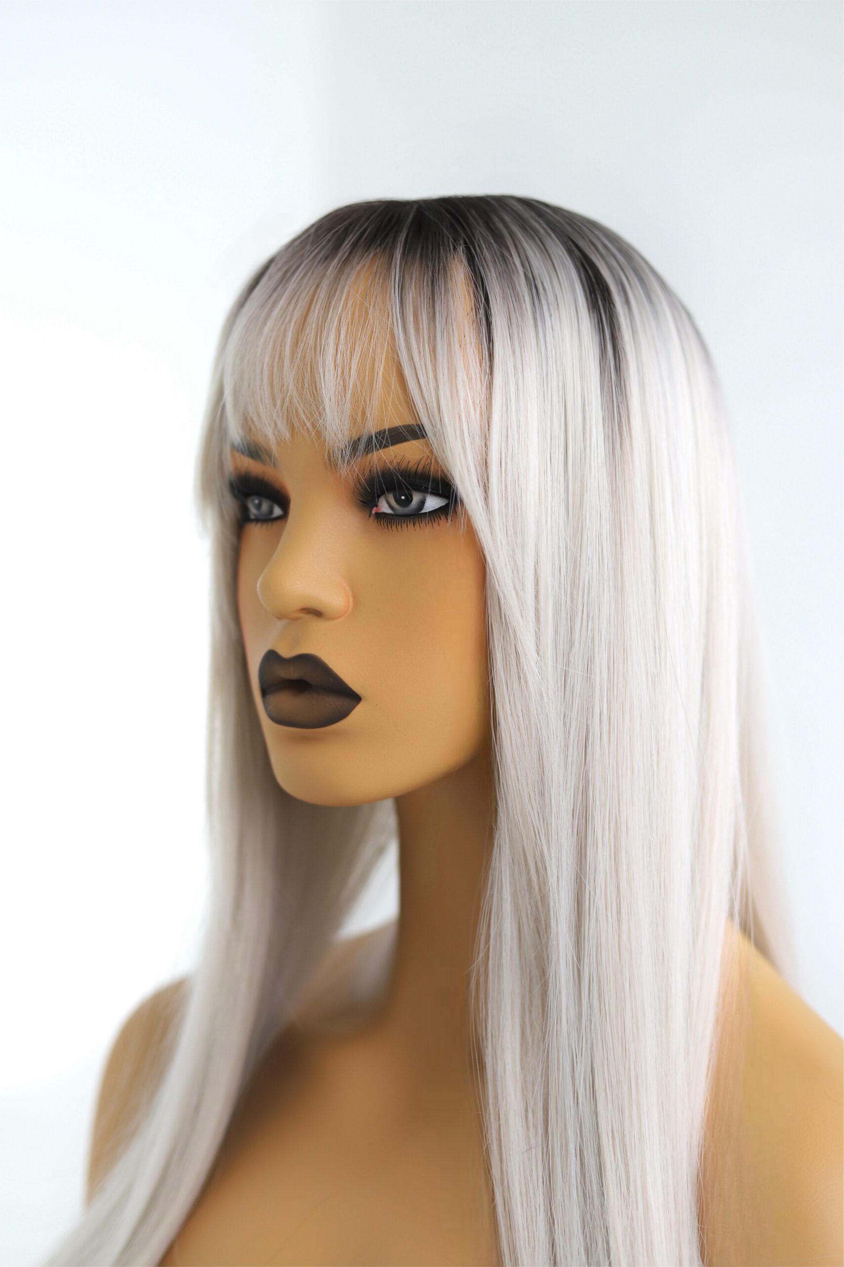 Odkryj swoją odważną stronę dzięki tej eleganckiej platynowej peruce z ciemnym odrostem i zmysłową grzywką. Idealna na każdą okazję – od imprez po sesje zdjęciowe.
