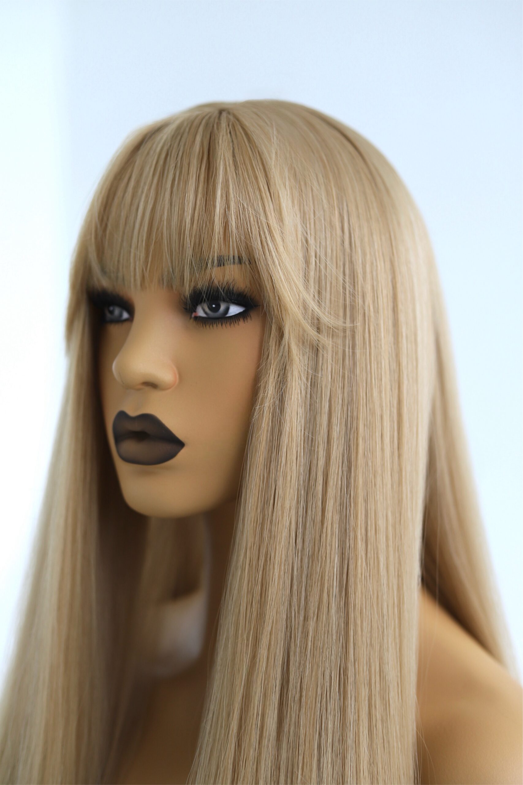 Długa Peruka w odcieniu złoty blond z Grzywką.