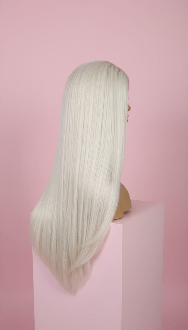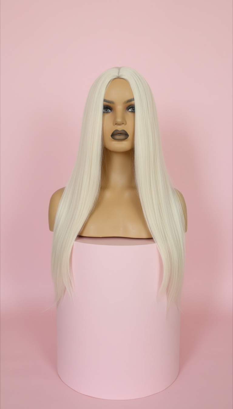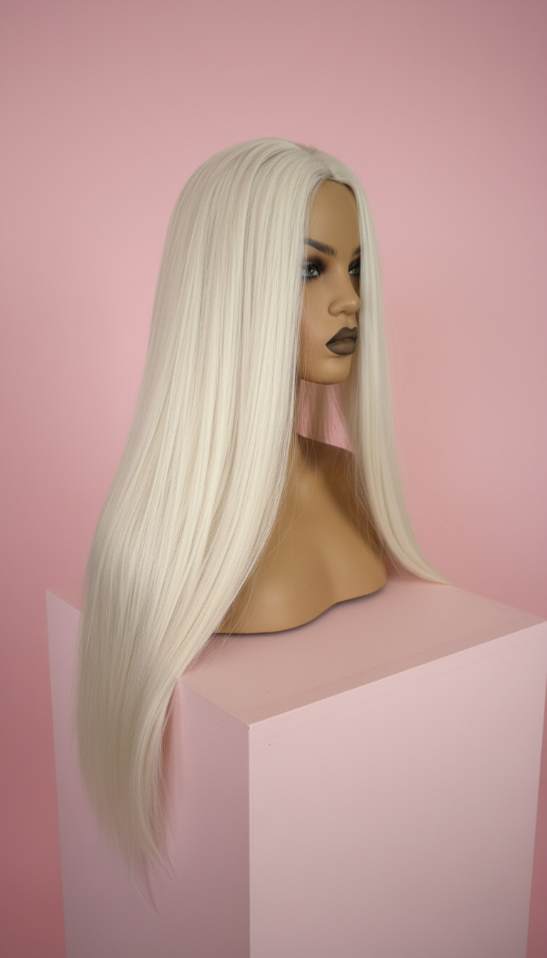 Długa prosta peruka w kolorze platynowy blond z realistycznym efektem mikroskóry na przedziałku, który tworzy naturalną iluzję skóry głowy. Jedwabista, gładka struktura włókna oraz idealnie prosta linia włosów nadają fryzurze wyjątkowo elegancki, sophisticated look. To model dla osób, które szukają minimalistycznej, luksusowej fryzury o spektakularnej długości i perfekcyjnej gładkości.