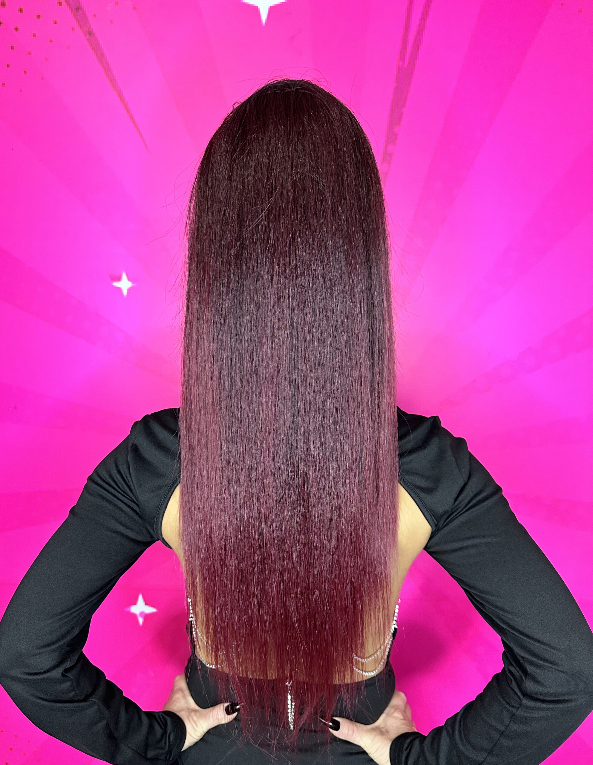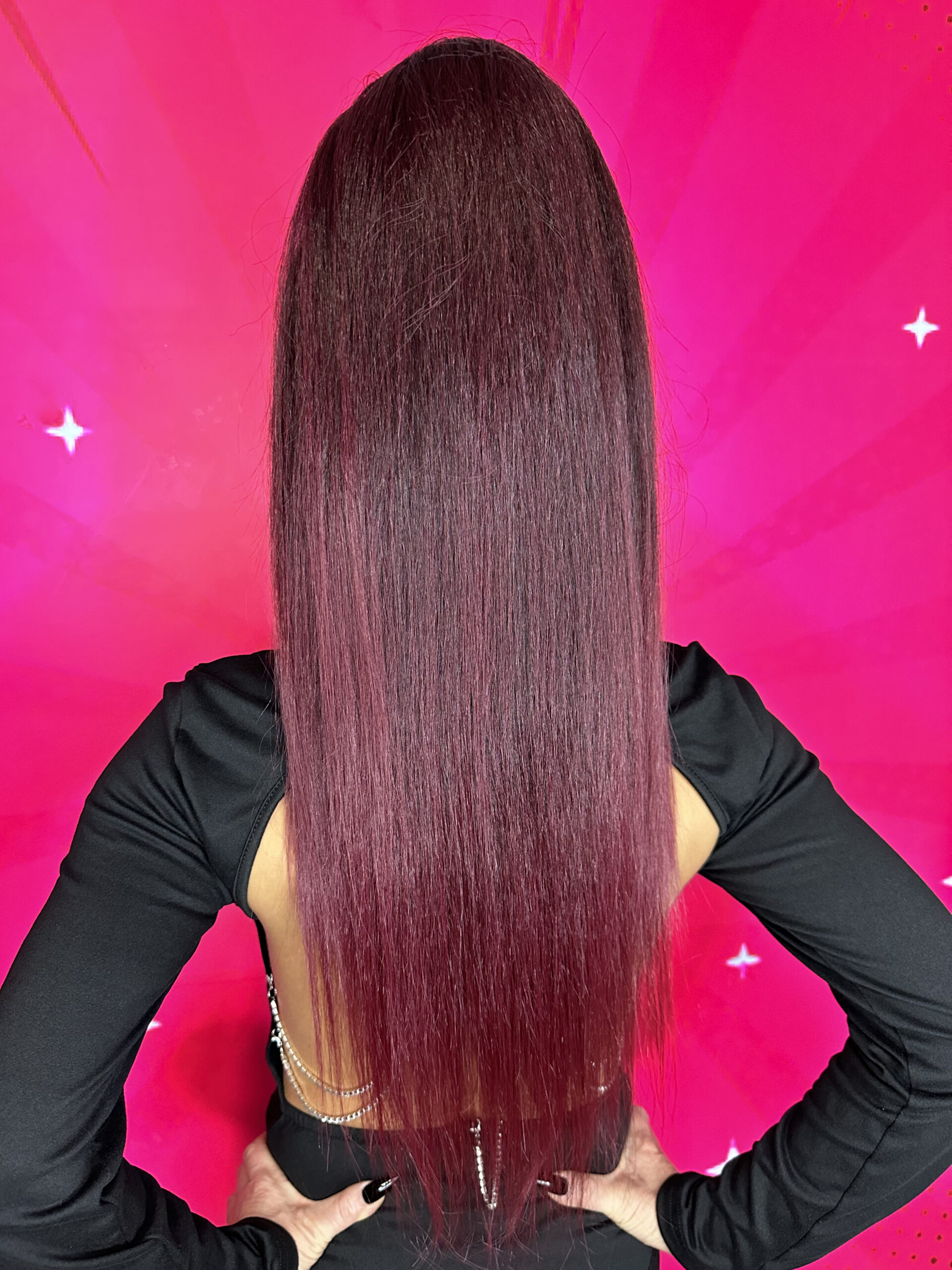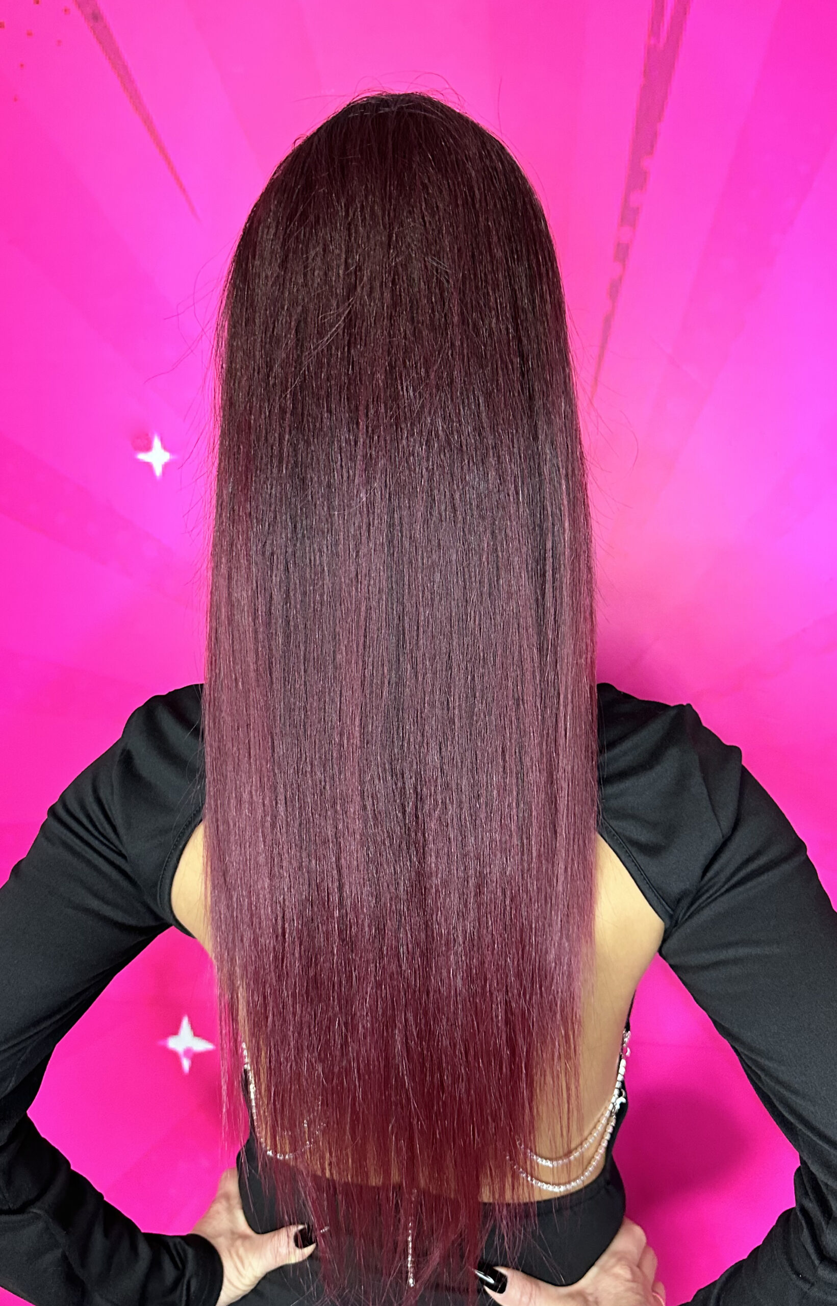 Odcień bordowy to połączenie czerni i bordowych tonów. Kolor jest wyrazisty, a jednocześnie elegancki, dlatego dobrze sprawdza się w wielu stylizacjach. Bordowe włosy podkreślają rysy twarzy i dodają fryzurze charakteru, zachowując przy tym naturalny wygląd. Ten odcień pasuje zarówno do chłodnych, jak i cieplejszych typów urody.