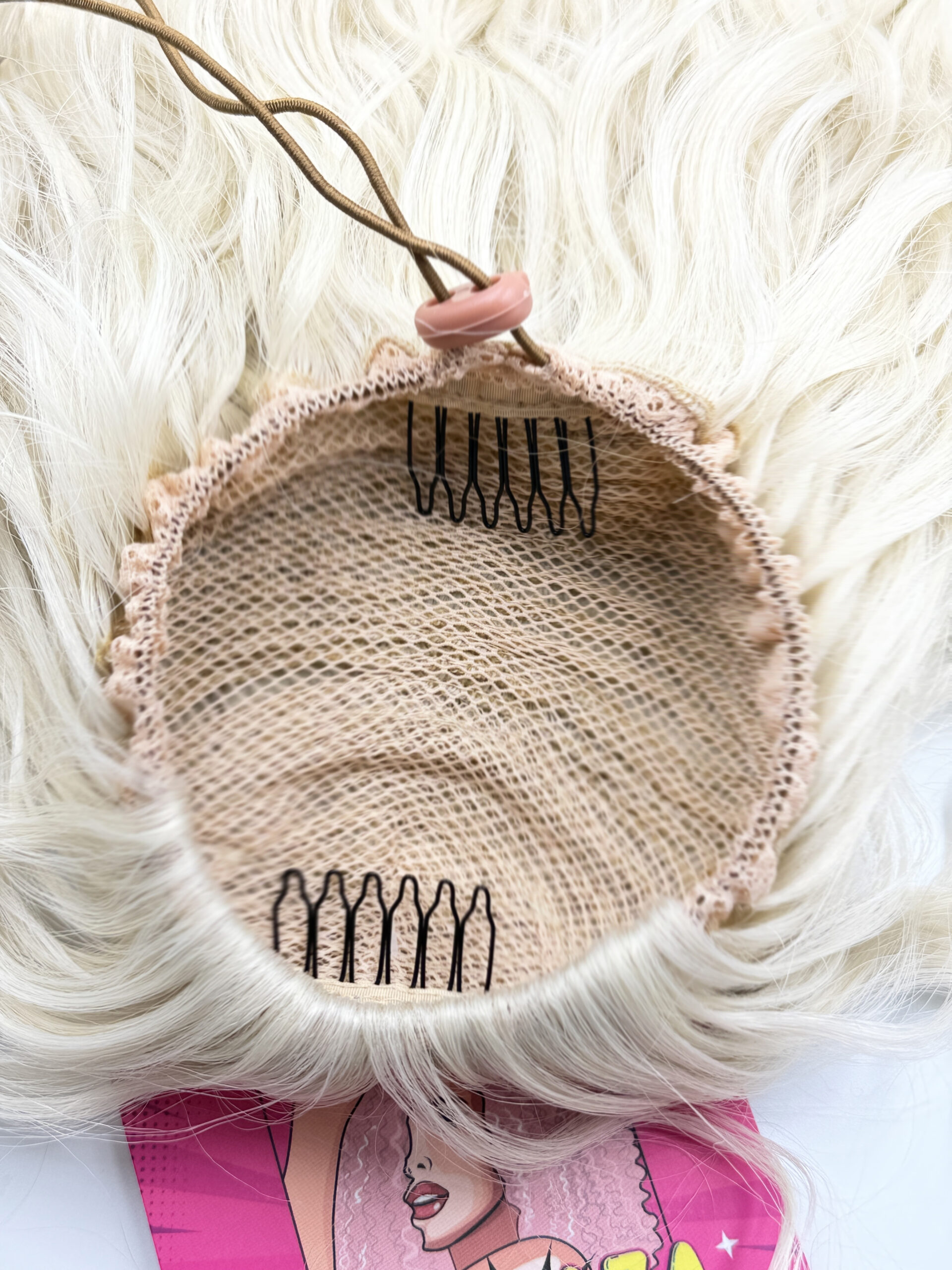 Ten doczepiany kucyk platynowy blond małe fale dodaje objętości i elegancji, a jego miękkie, delikatne pasma pięknie układają się w drobne fale.