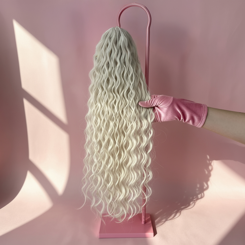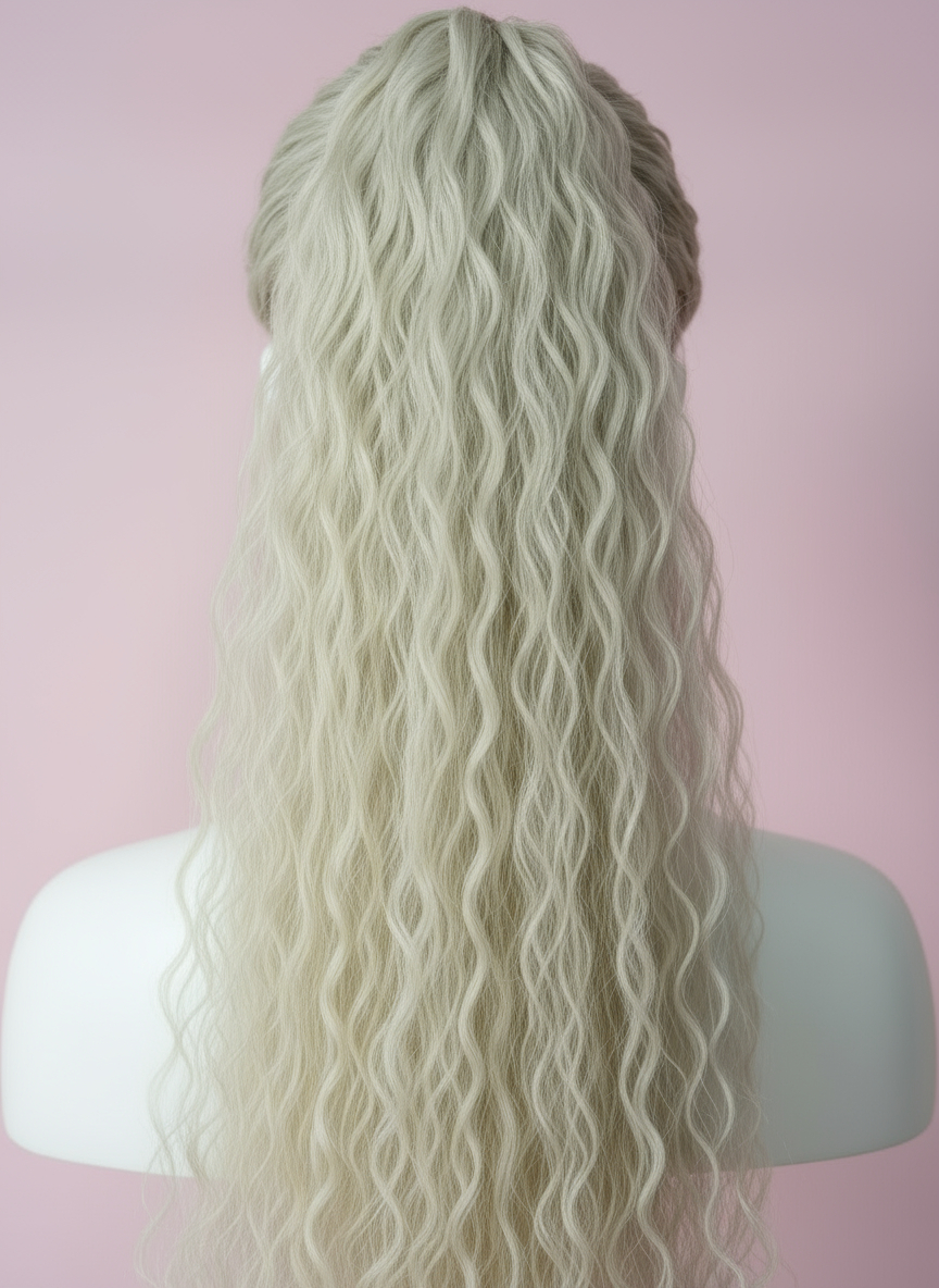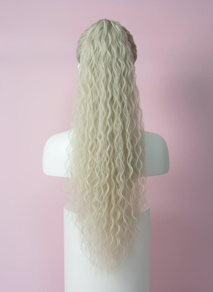 Odmień swoją fryzurę w kilka chwil dzięki doczepianemu kucykowi platynowy blond małe fale – stylowemu rozwiązaniu dla kobiet, które marzą o gęstych, falujących włosach w modnym, chłodnym odcieniu blondu.