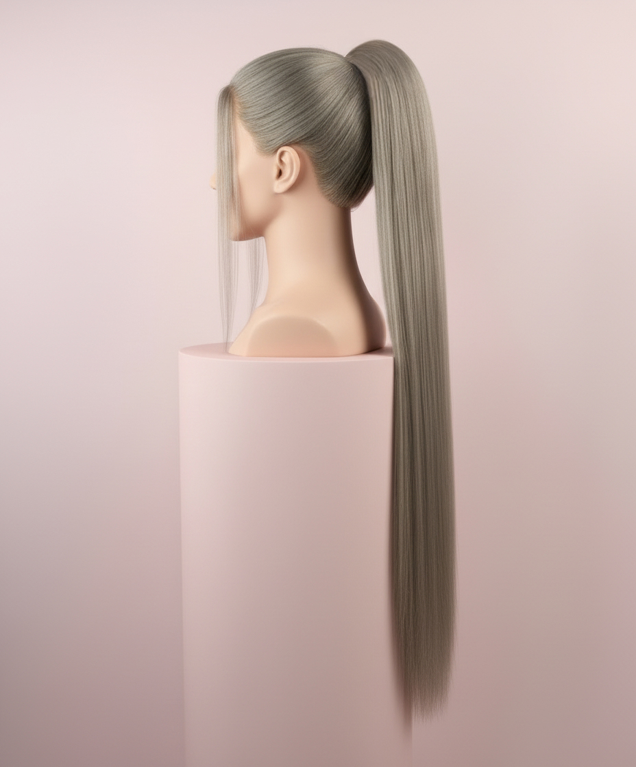 Ten prosty kucyk popielaty blond 90 cm ma imponującą długość. Włosy są gładkie i równo opadają, a końcówki zostały naturalnie pocieniowane. Dzięki temu fryzura wygląda lekko, miękko i bardziej realistycznie. Długość daje efekt wow i pięknie podkreśla sylwetkę.