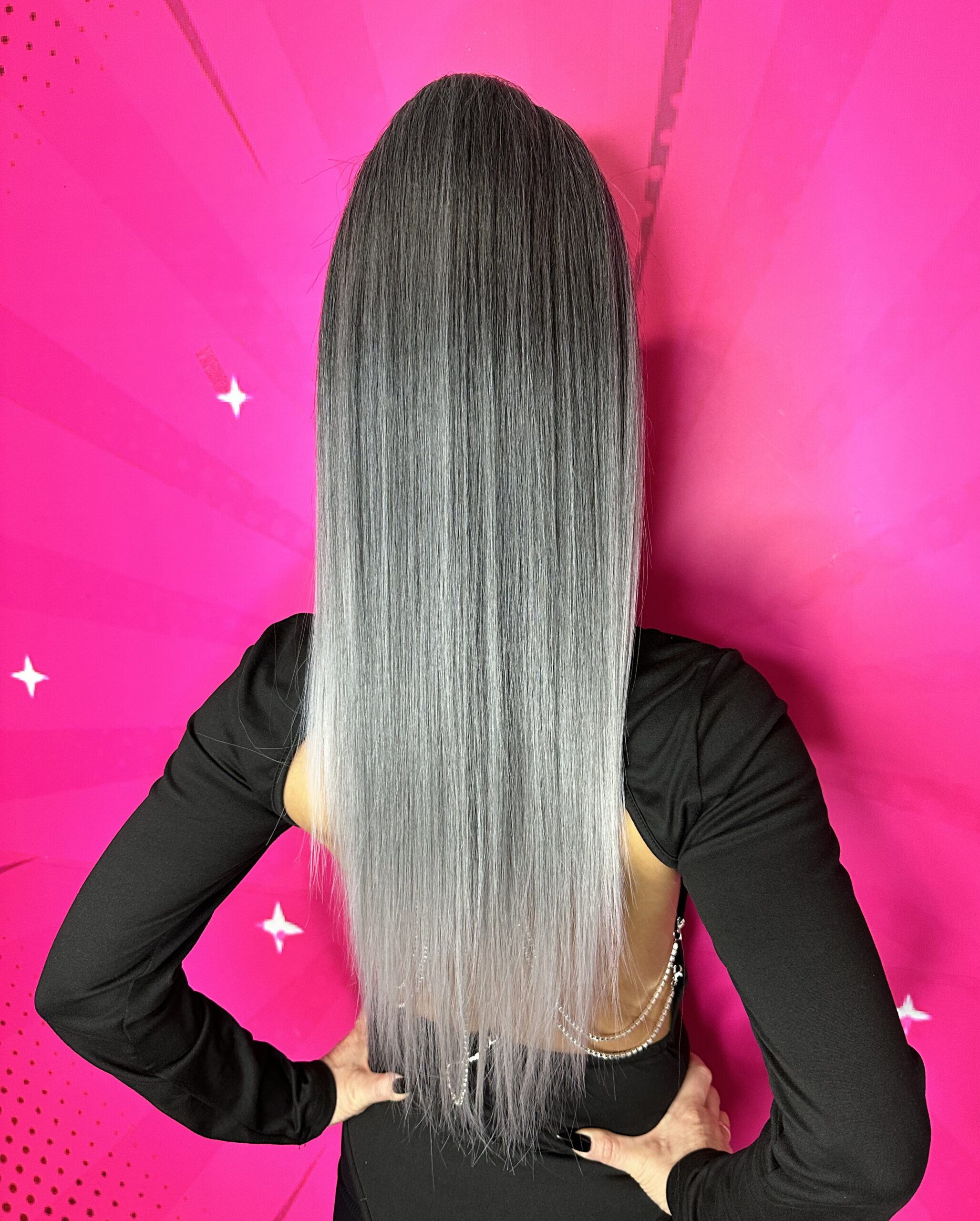 Kolor siwy ombre to połączenie ciemniejszej nasady z jaśniejszymi, popielatymi końcówkami, które tworzą płynne przejście tonów. Ten odcień jest niezwykle modny i uniwersalny – pasuje do każdej karnacji, nadając fryzurze nowoczesny, chłodny charakter. Dzięki subtelnemu przejściu kolorów kucyk wygląda naturalnie, a fryzura nabiera lekkości i wyrafinowania.