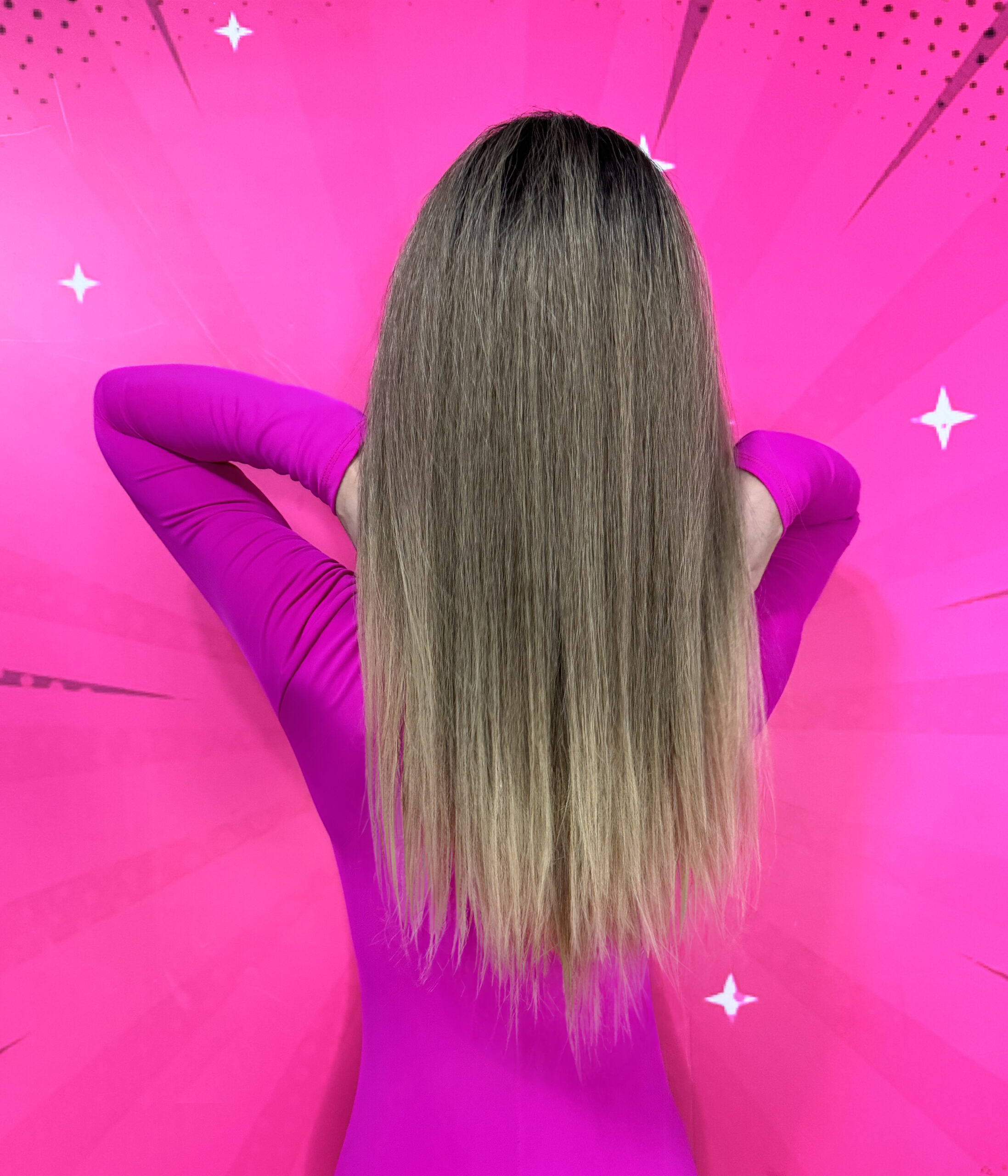Kolorystyka ombre w odcieniu ciemnego blondu tworzy płynne przejście między głębszym tonem u nasady a jaśniejszymi końcówkami. Efekt jest świeży, nowoczesny i niezwykle autentyczny, co sprawia, że fryzura wygląda jak po profesjonalnej koloryzacji w salonie.