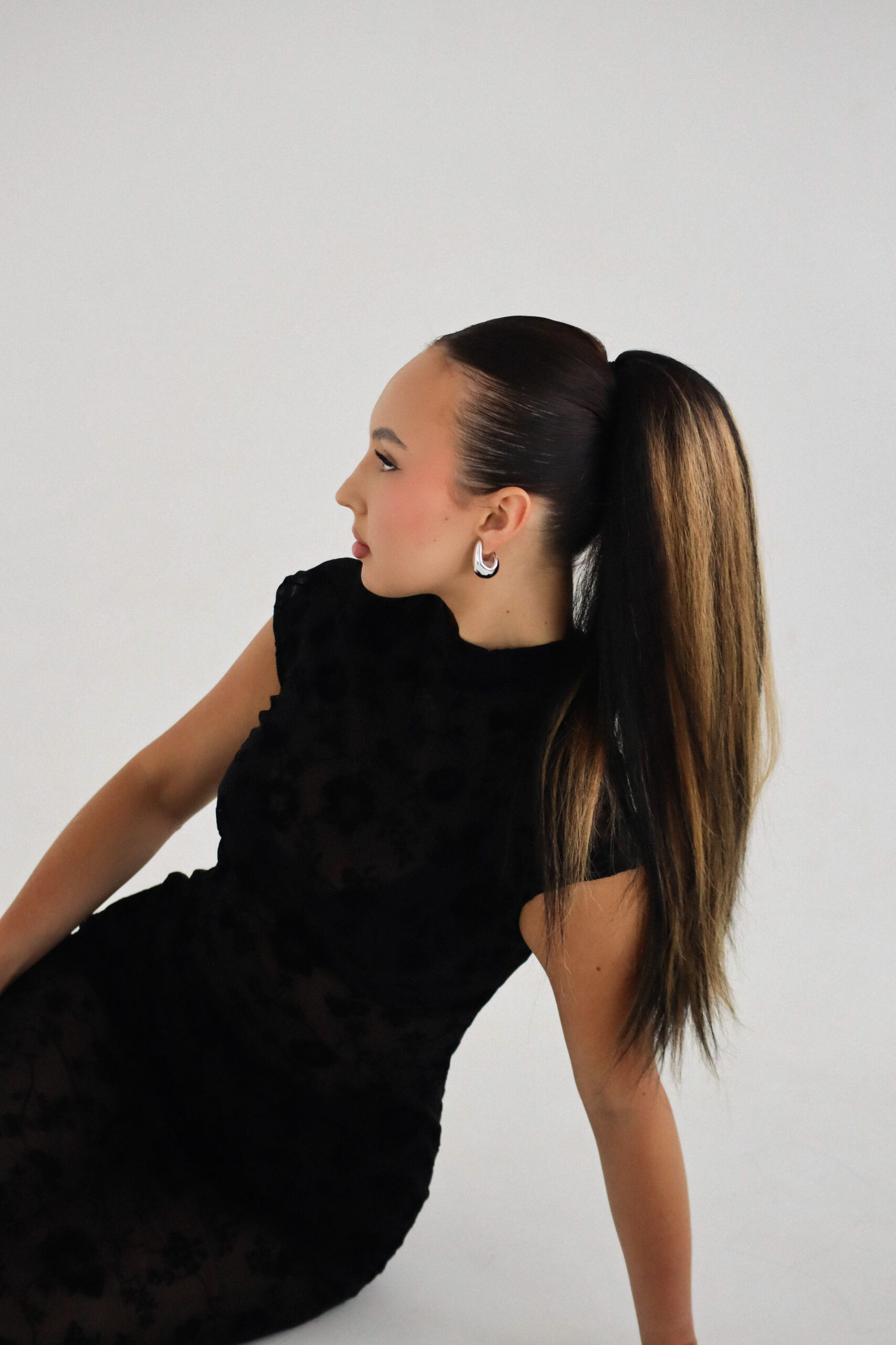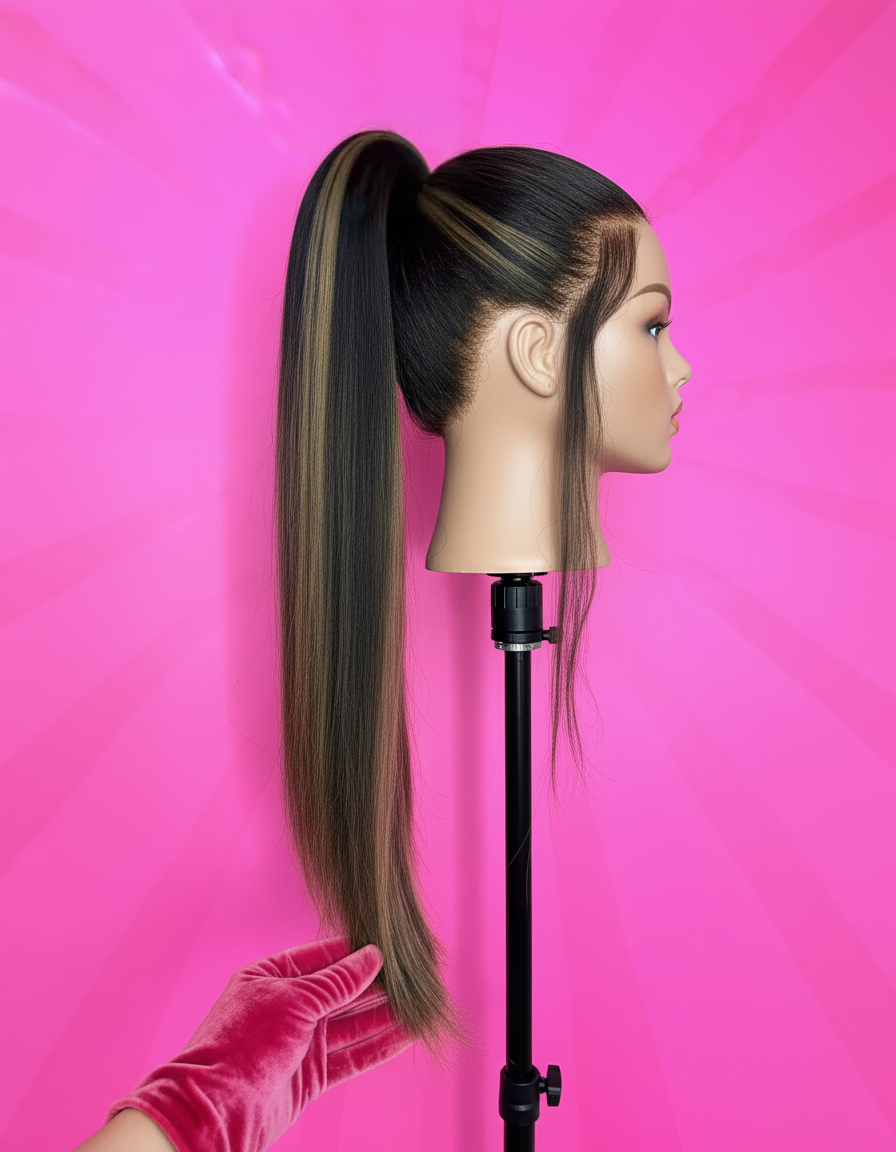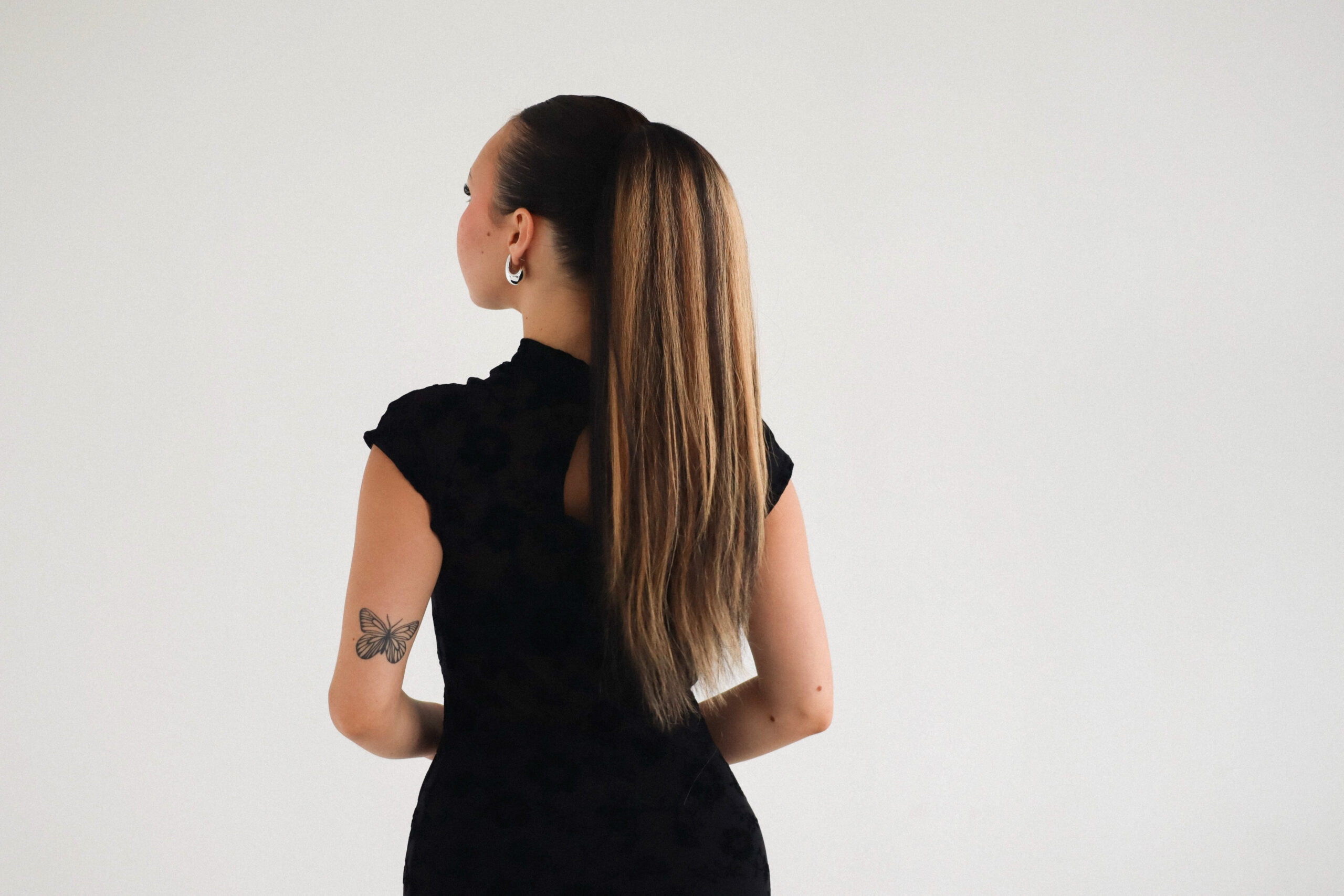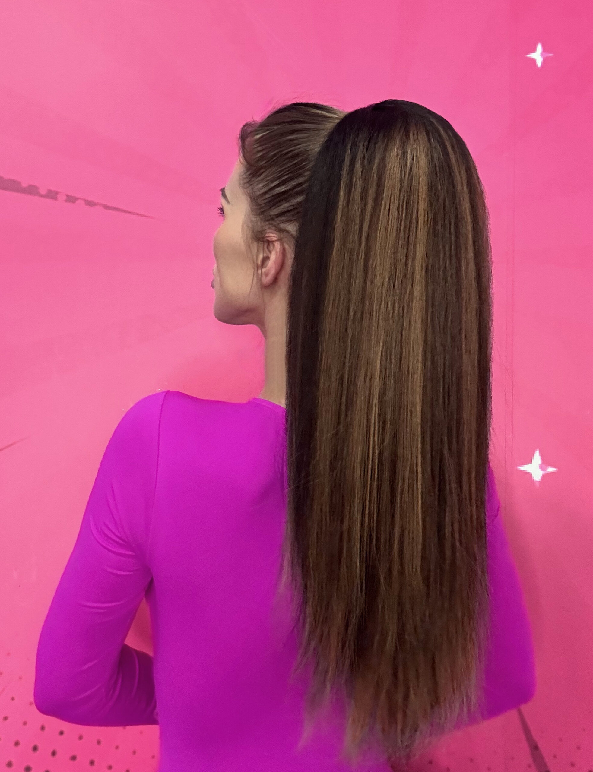 Kolor w odcieniu bardzo ciemnego brązu został wzbogacony o subtelny balejaż, który dodaje fryzurze głębi i naturalnych refleksów. Dzięki temu kucyk prezentuje się lekko, nowocześnie i wygląda jak po profesjonalnej koloryzacji w salonie. To świetne rozwiązanie zarówno na co dzień, jak i na specjalne okazje – wesele, imprezę czy spotkanie biznesowe.