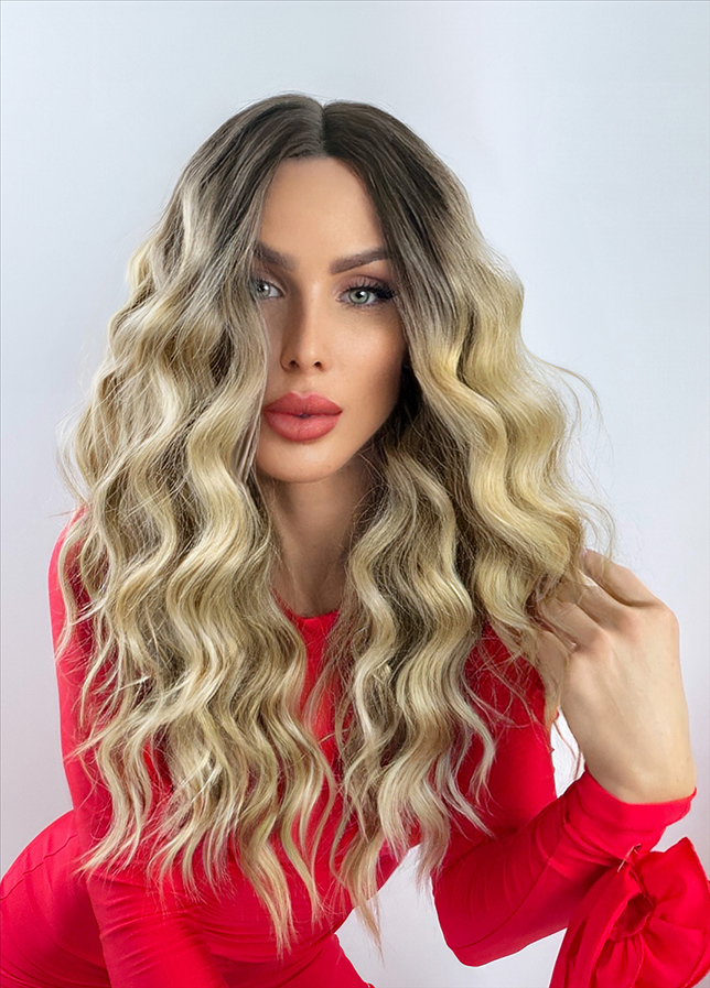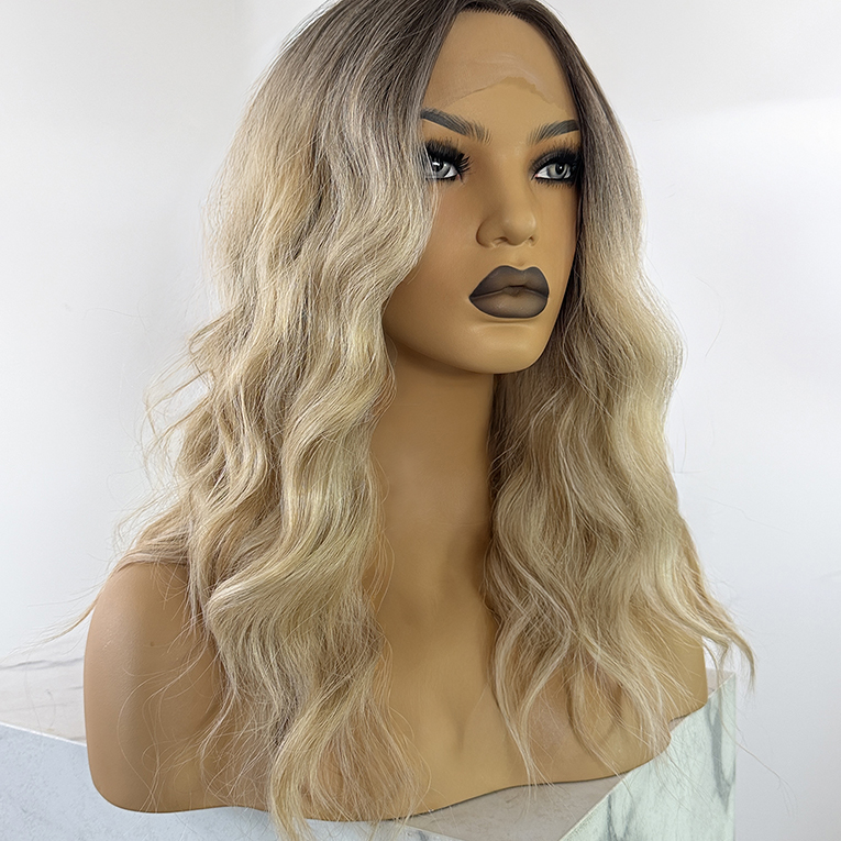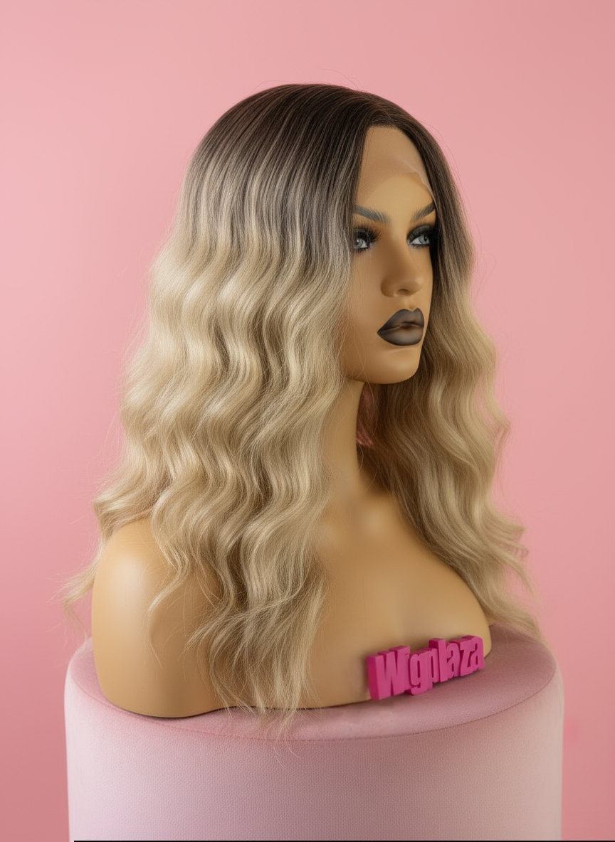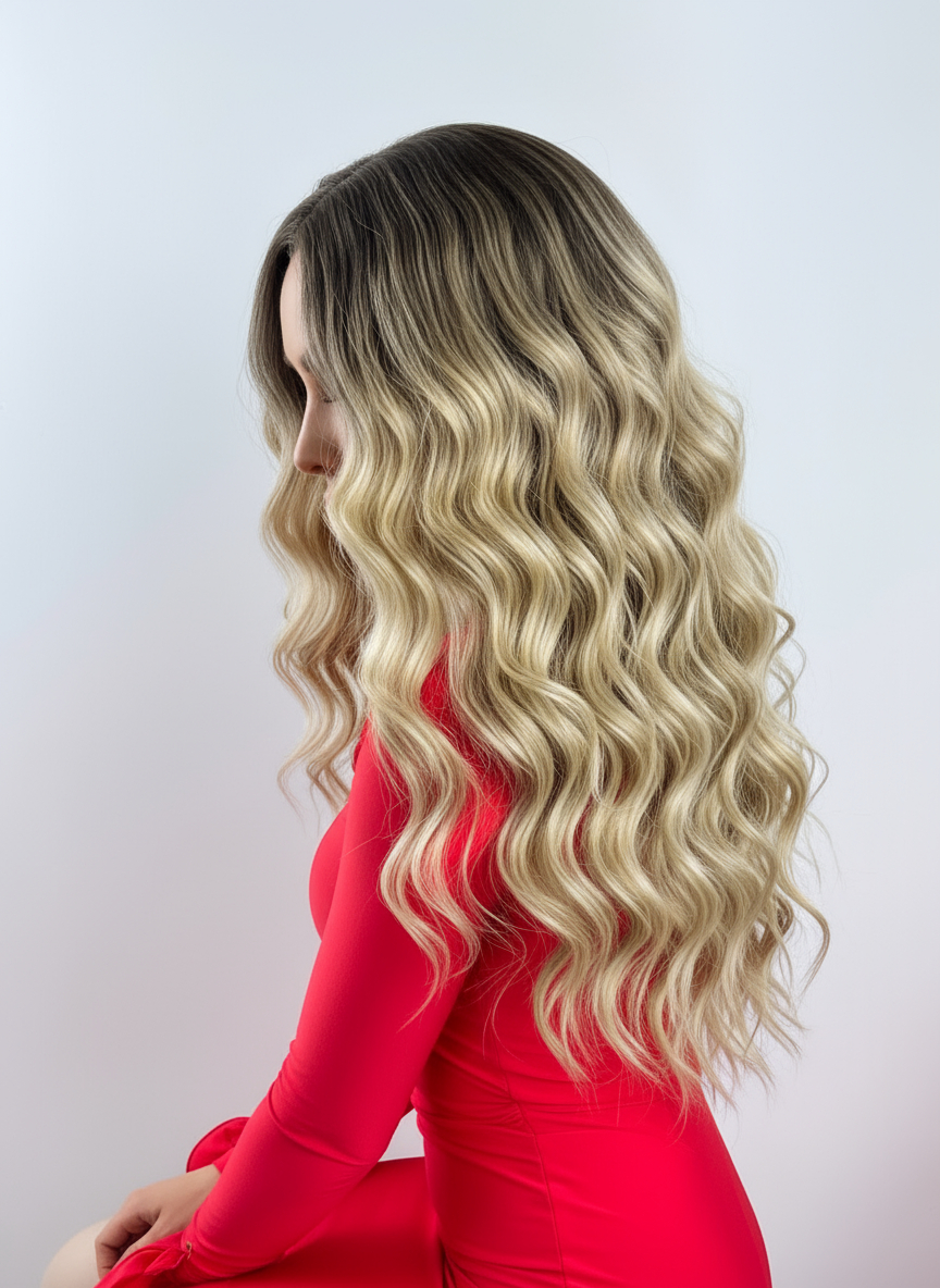 Falowana peruka blond lace front w kolorze blond z ciemniejszym odrostem. Naturalne fale, średnia długość za obojczyk oraz ręcznie tkany przedziałek zapewniają realistyczny efekt skóry i pełen komfort noszenia.