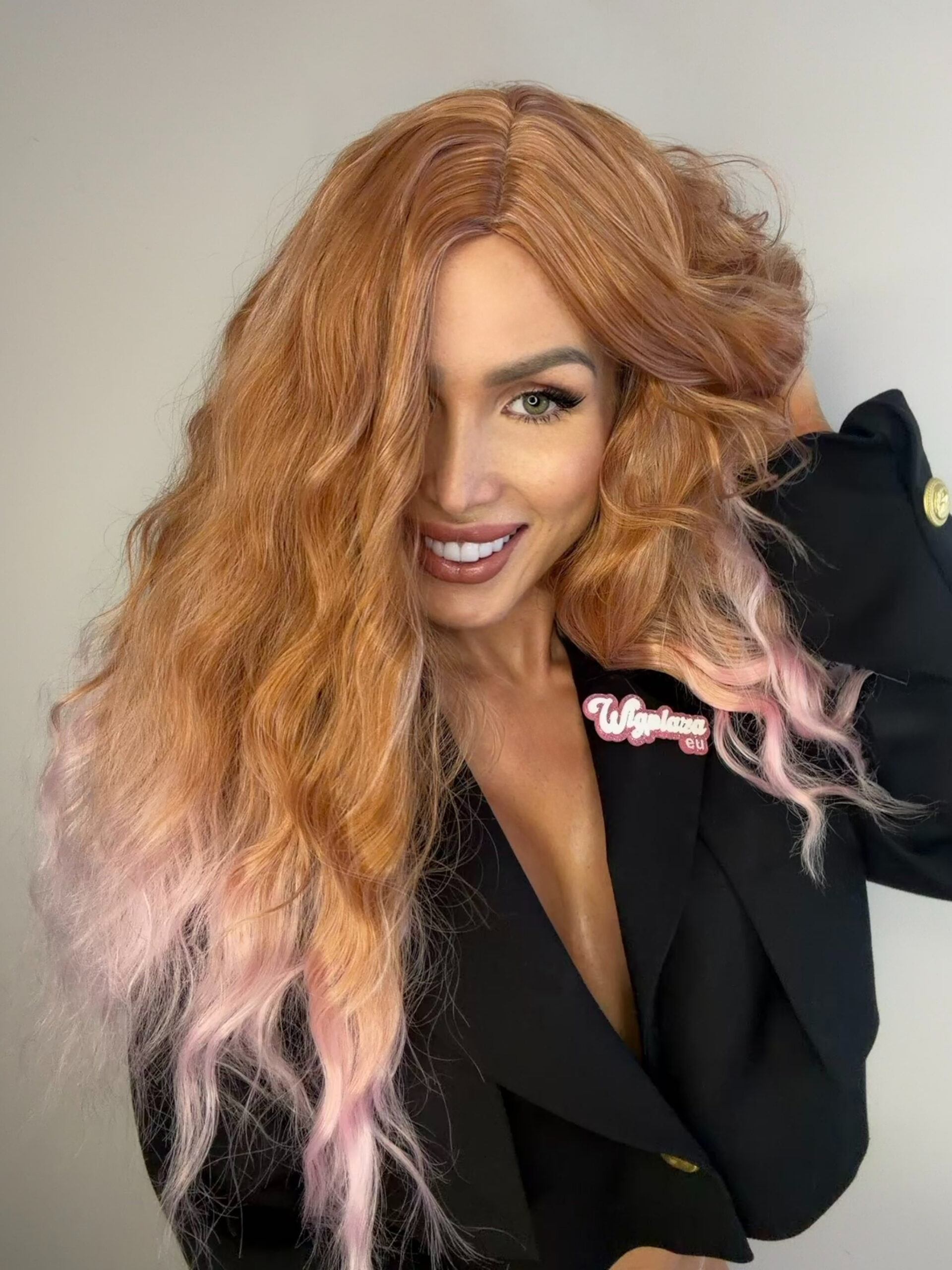 Falowana różowa peruka w odcieniach brzoskwiniowego różu i baby pink urzeka sprężystymi, mokrymi falami w stylu Ariel. Przed rozczesaniem daje efekt jak po zanurzeniu w wodzie, a po lekkim przeczesaniu zamienia się w pełną objętości, burzę włosów. Melanż fantazyjnych kolorów i miękkie, lejące się włosy sprawiają, że peruka prezentuje się wyjątkowo efektownie.