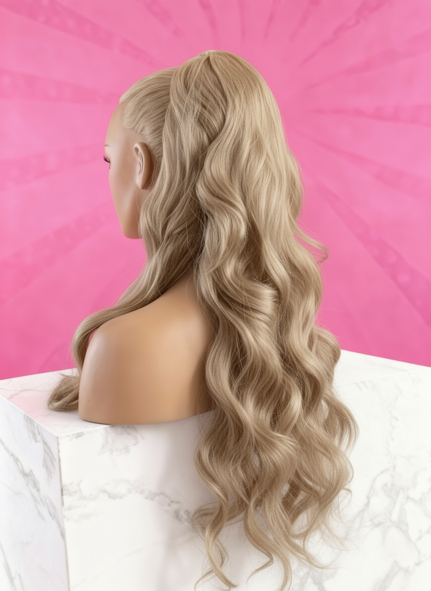 Falowany kucyk w odcieniu piaskowego blondu to naturalny, stonowany kolor o matowym wykończeniu. Idealny dla posiadaczek neutralnego blondu, bez wyraźnych żółtych czy srebrnych refleksów.
