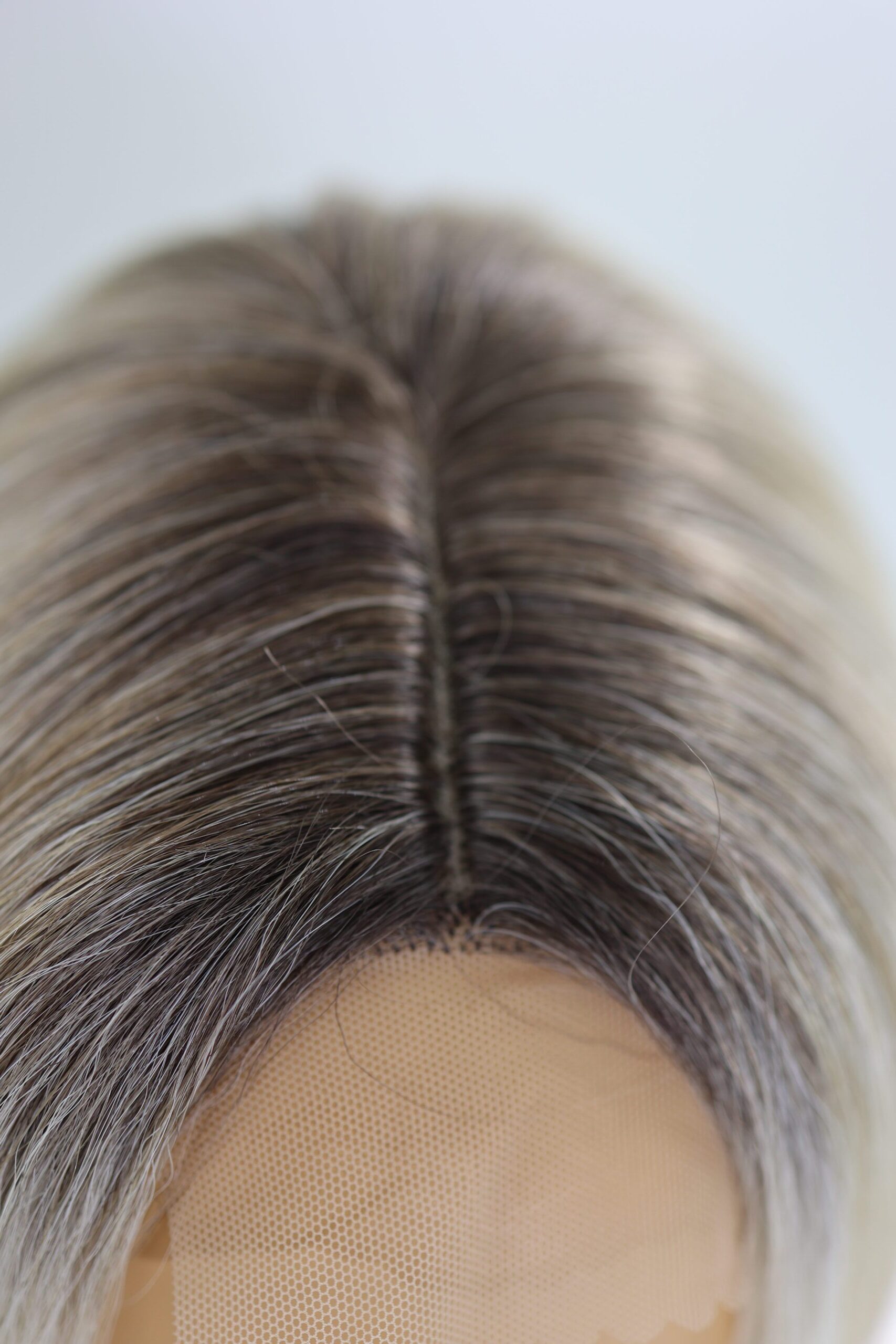 Ten blond bob lace front premium zachwyca subtelnym efektem ciemniejszego odrostu, który przechodzi w rozświetlone jaśniejsze pasma przy twarzy (face framing highlights).