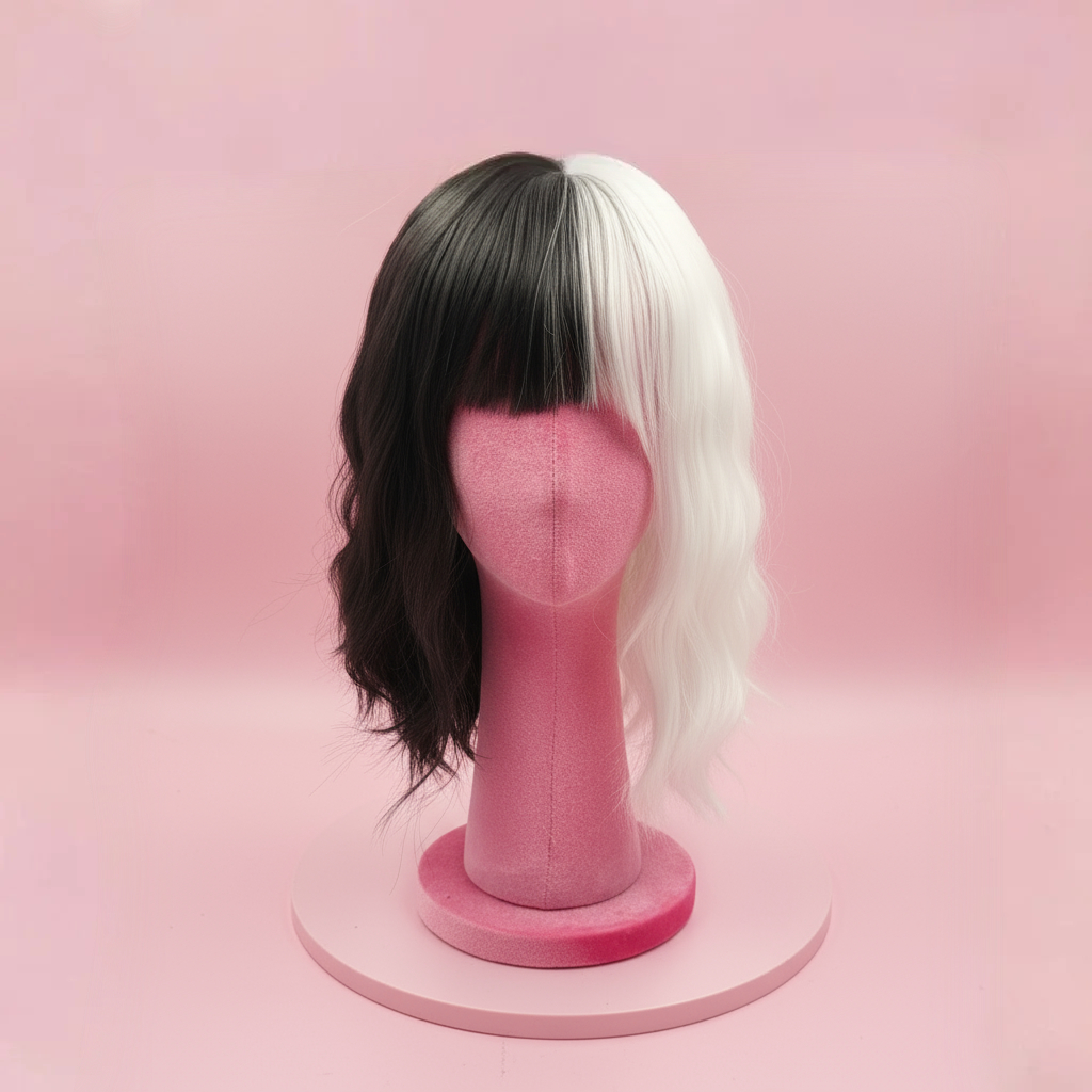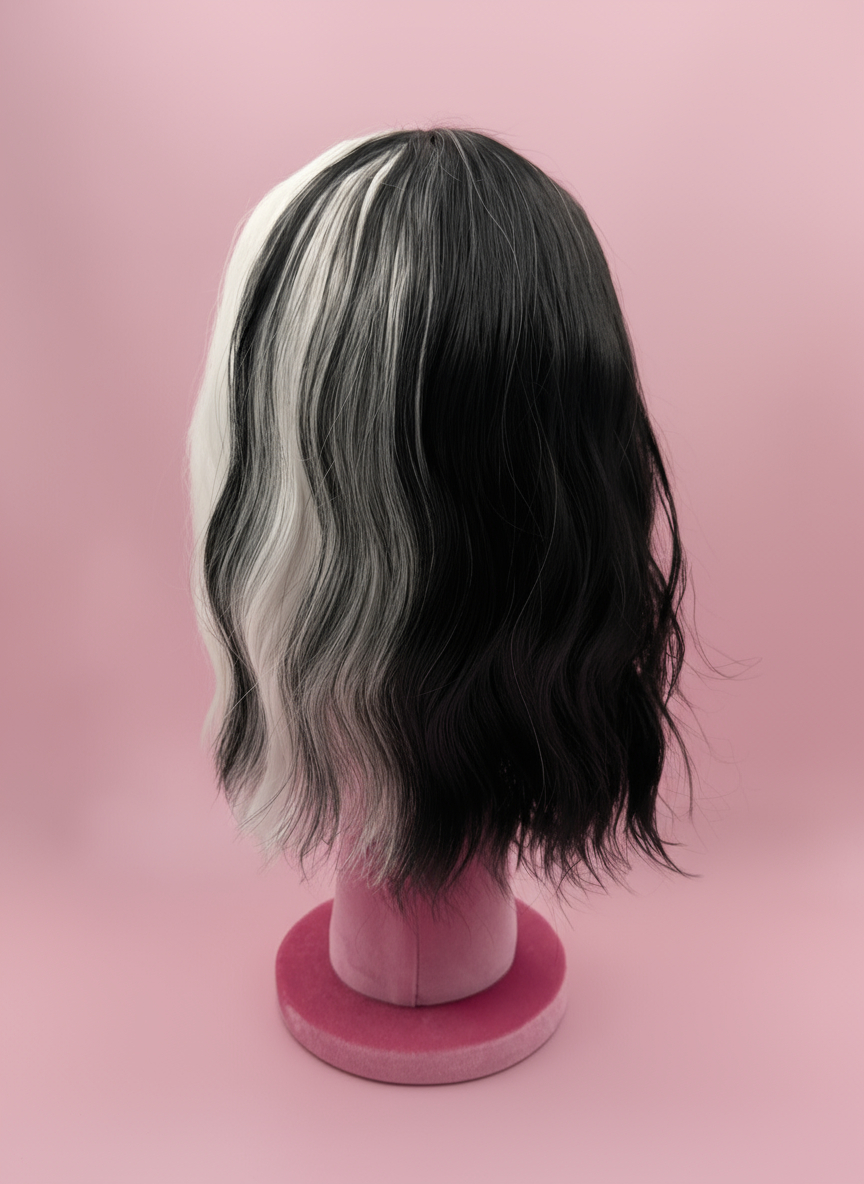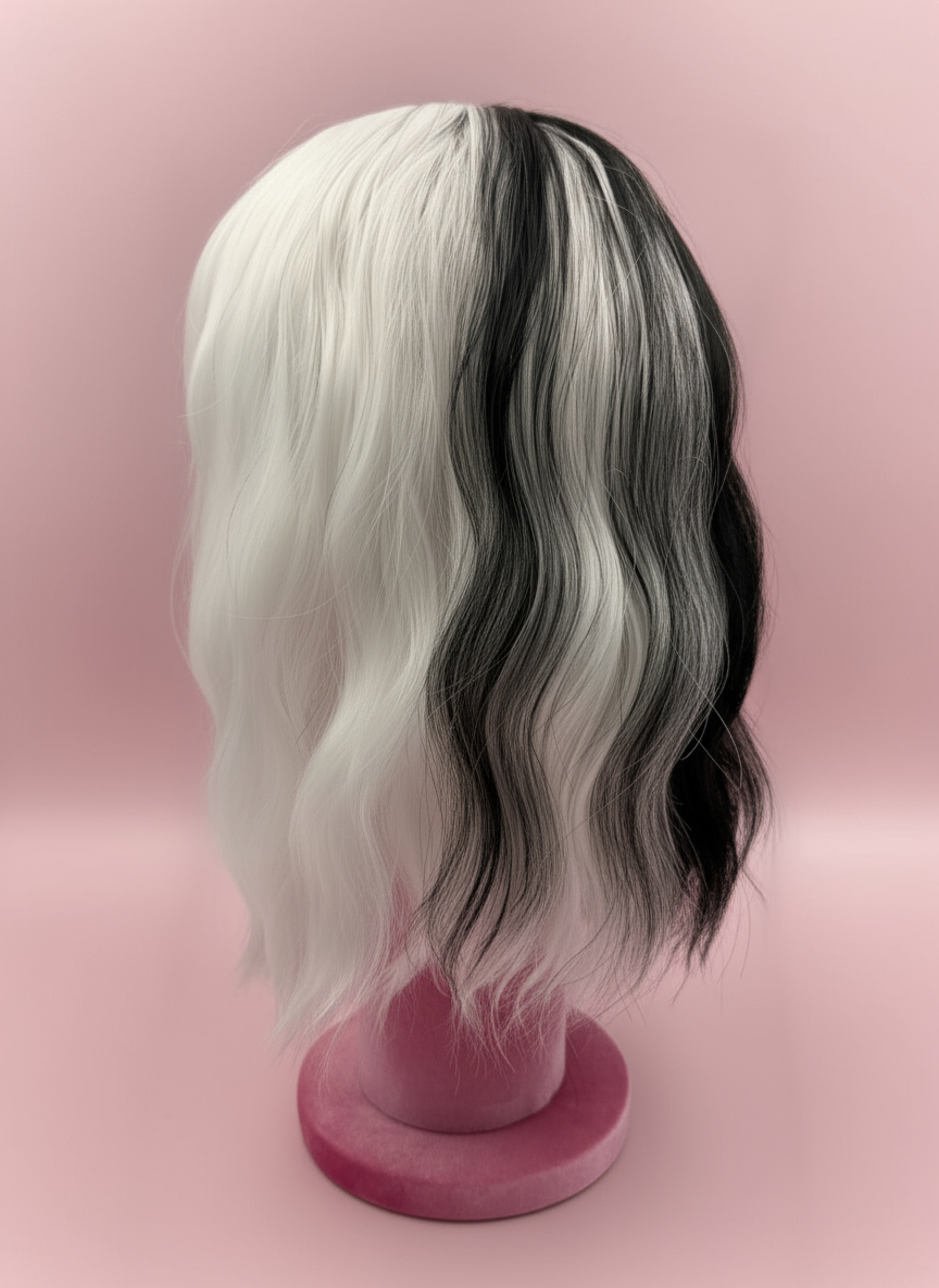 Peruka Czarno-Biała z Grzywką to wyjątkowy model o charakterystycznym, kontrastowym wyglądzie. Połowa włosów w głębokim odcieniu czerni, druga – w śnieżnobiałym kolorze – tworzą efektowny, rozpoznawalny styl. Prosta grzywka nadaje całości klasyczny, filmowy wygląd inspirowany postacią Cruelli i innymi odważnymi stylizacjami.