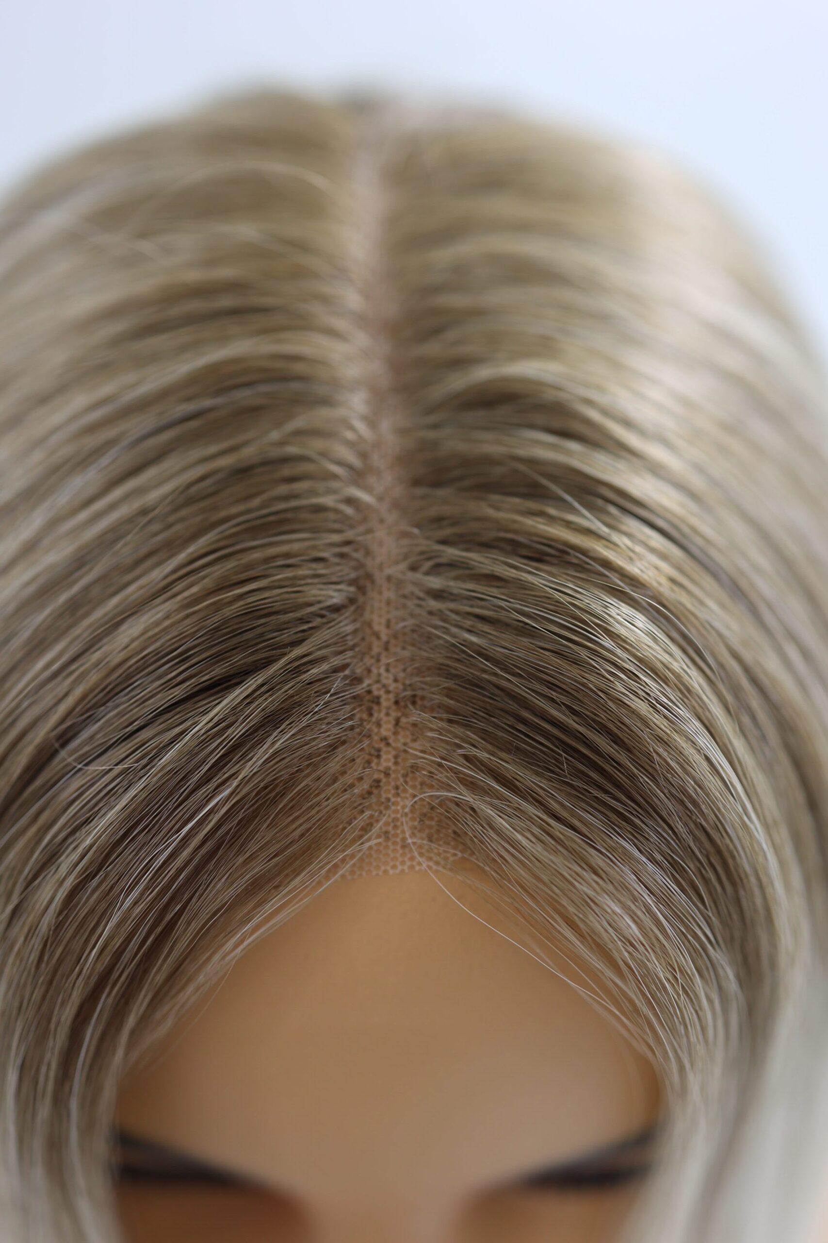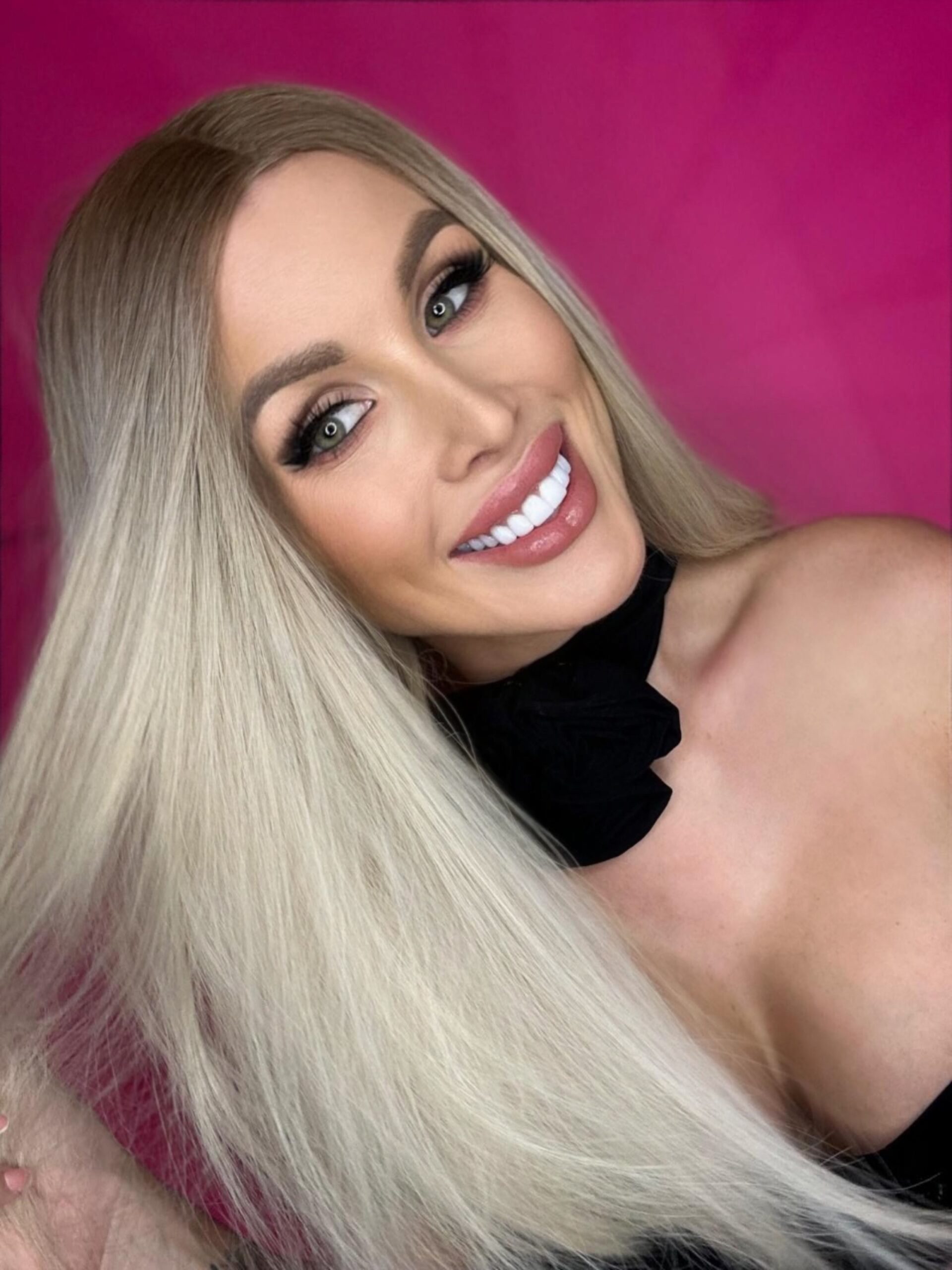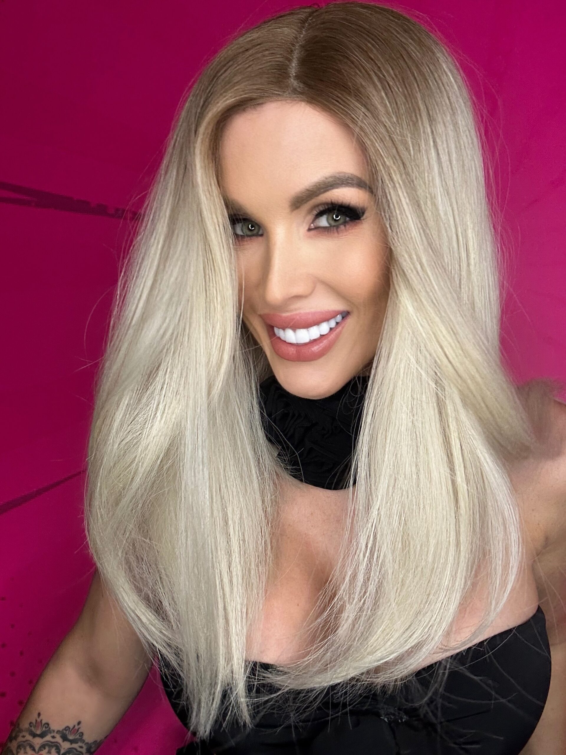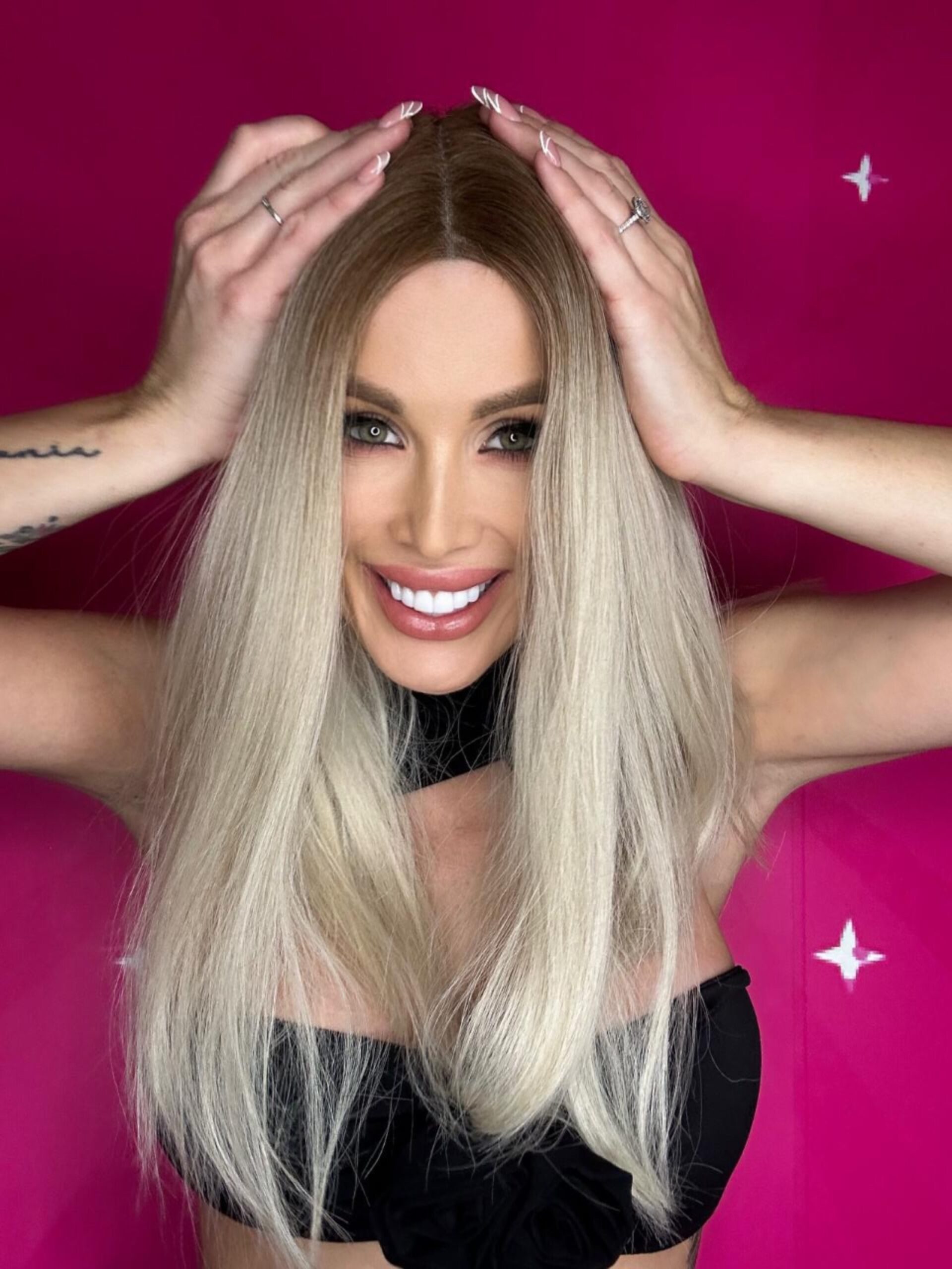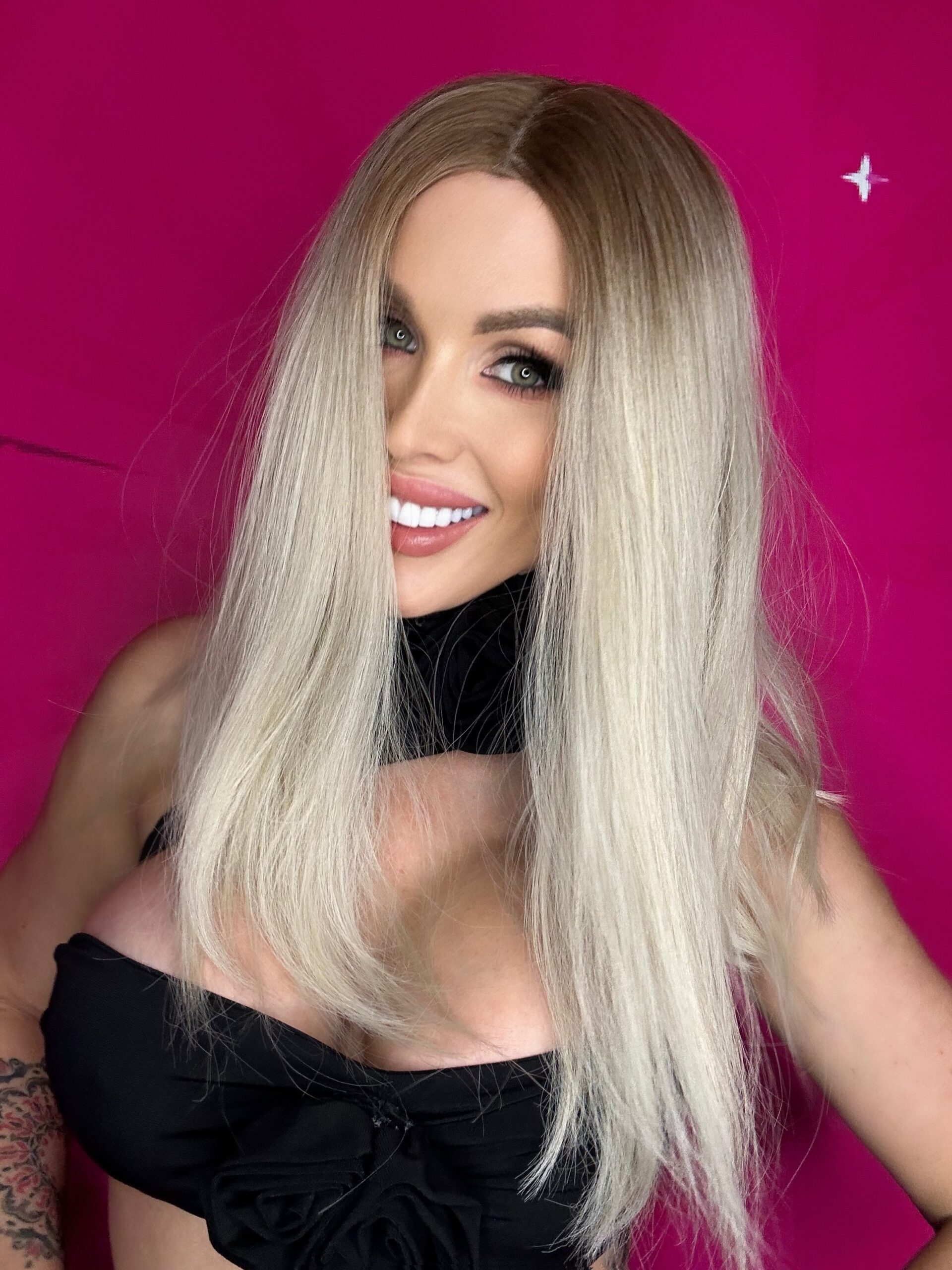 To model, który łączy naturalny wygląd, wygodę i perfekcyjną koloryzację – delikatny odrost w odcieniu średniego blondu płynnie przechodzi w jaśniejsze pasma, tworząc efekt świeżego, naturalnego blondu.