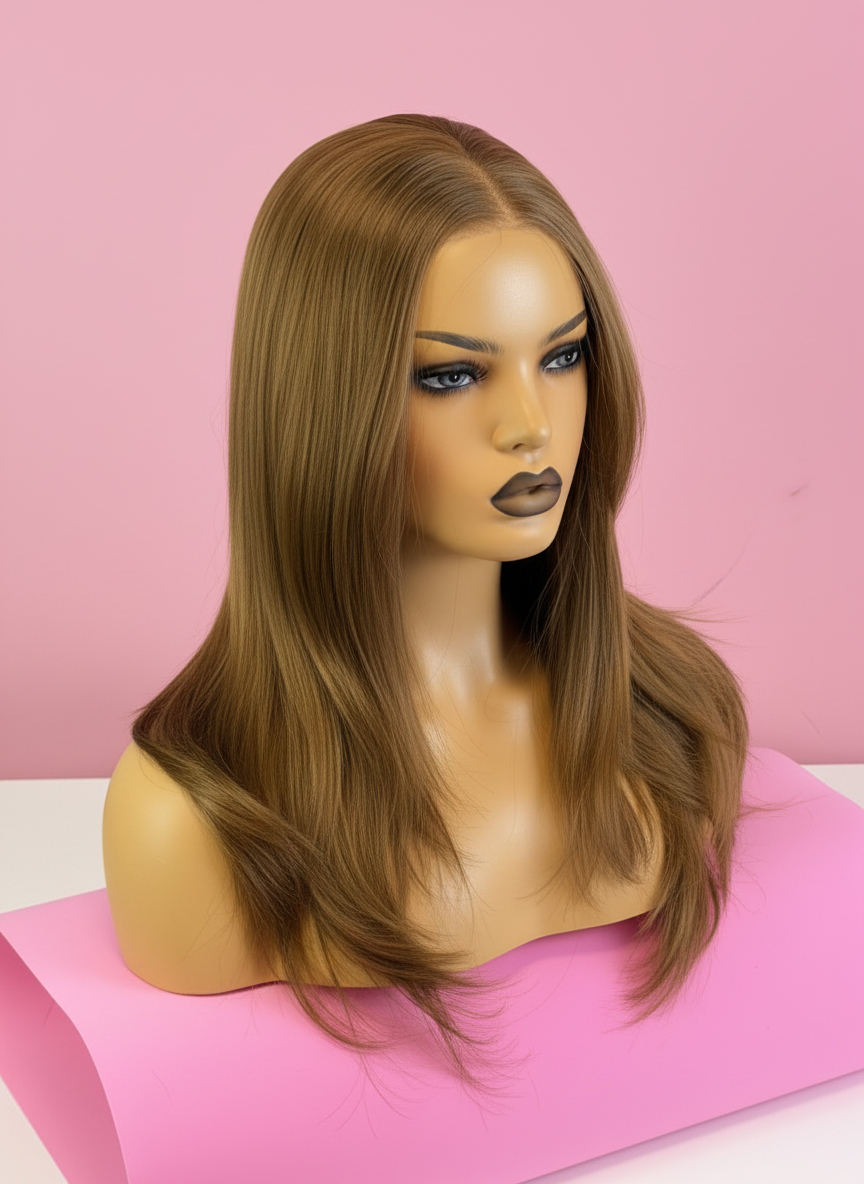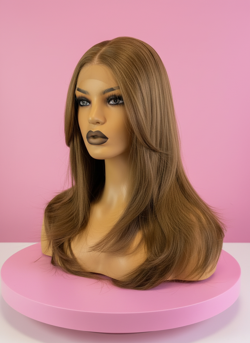 Peruka karmelowy blond lace front w ciepłym, naturalnym odcieniu. Cieniowana fryzura miękko układa się przy twarzy. Premium lace front i ręcznie tkany przedziałek dają efekt naturalnych włosów.
