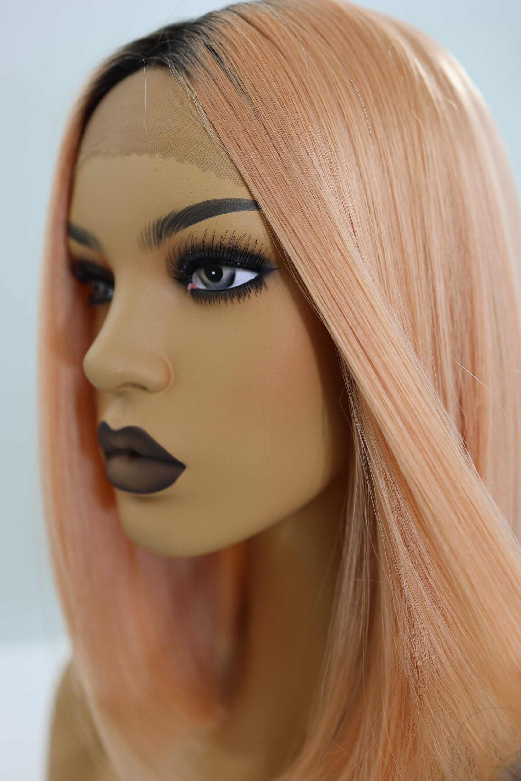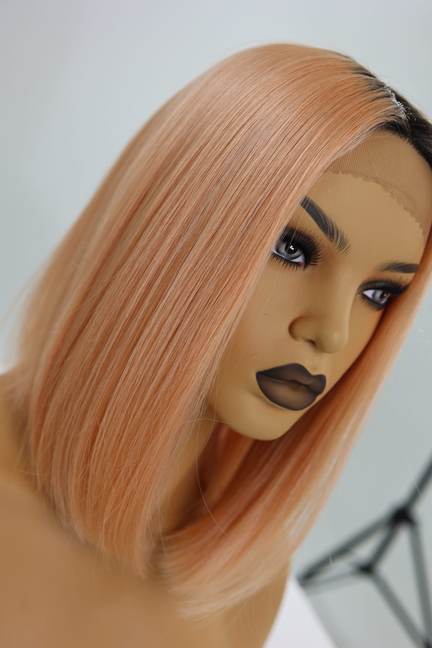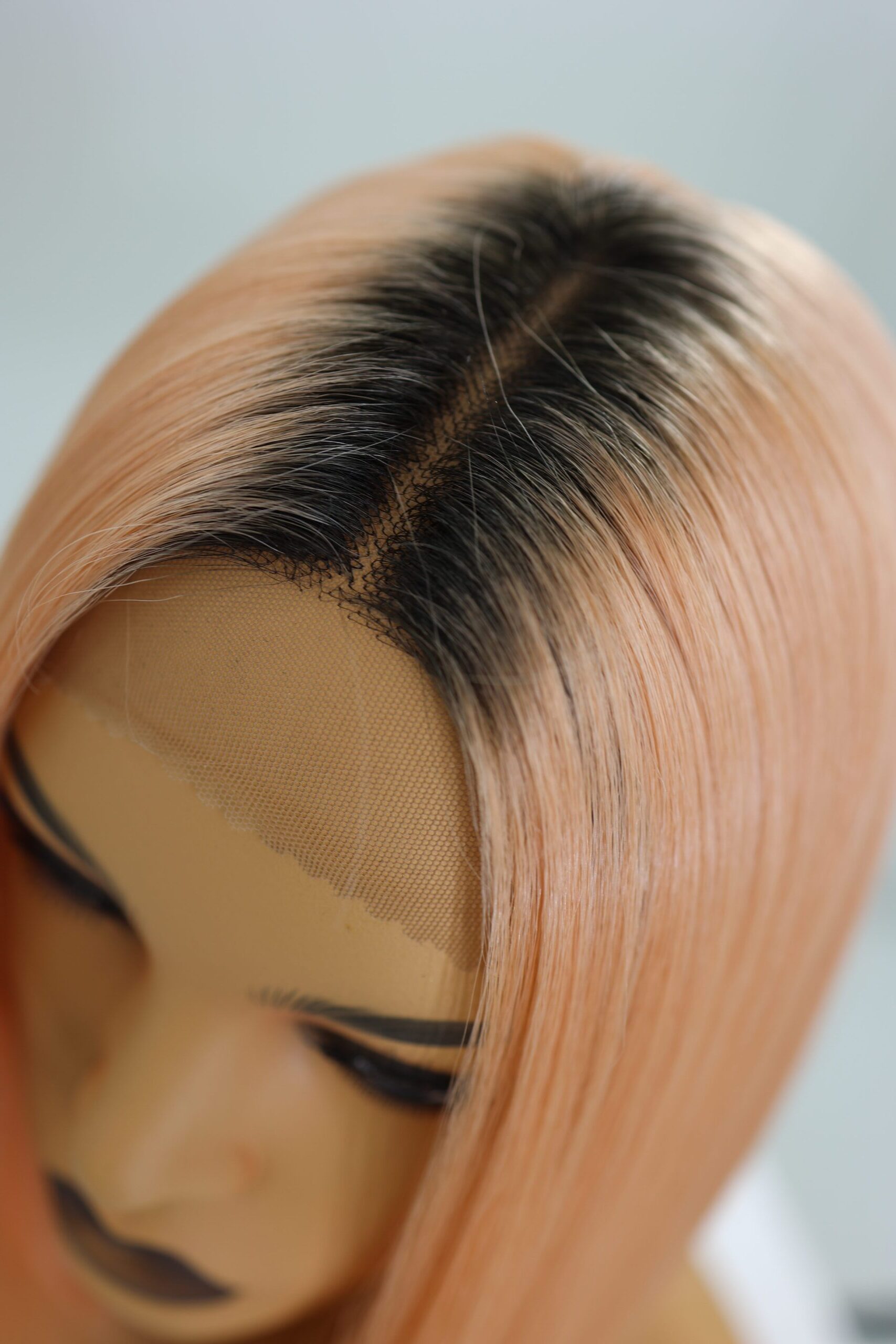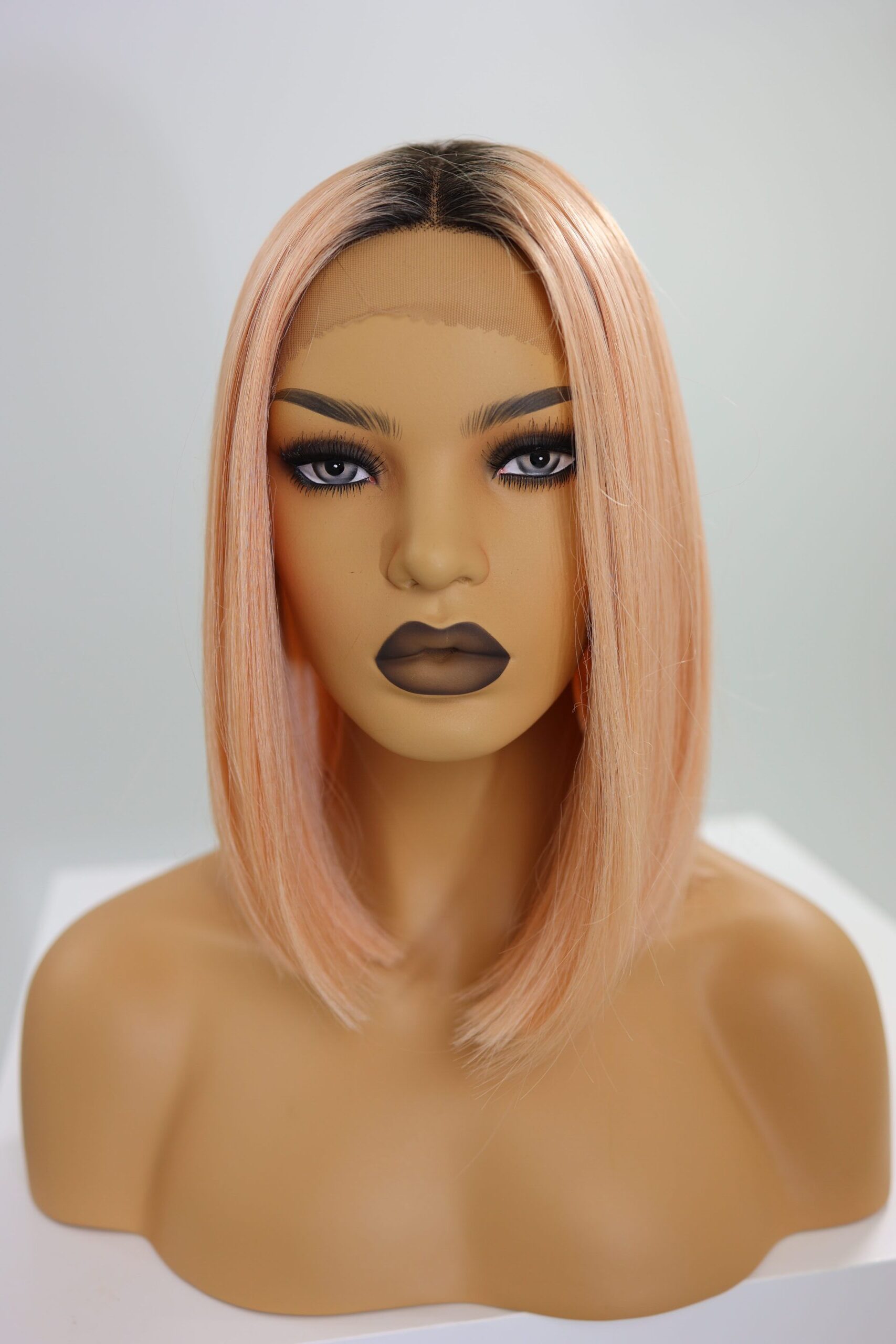 Peruka syntetyczna typu bob front lace w odcieniu ciepłego różu, ciemny odrost. Ulubiony model naszych klientek.