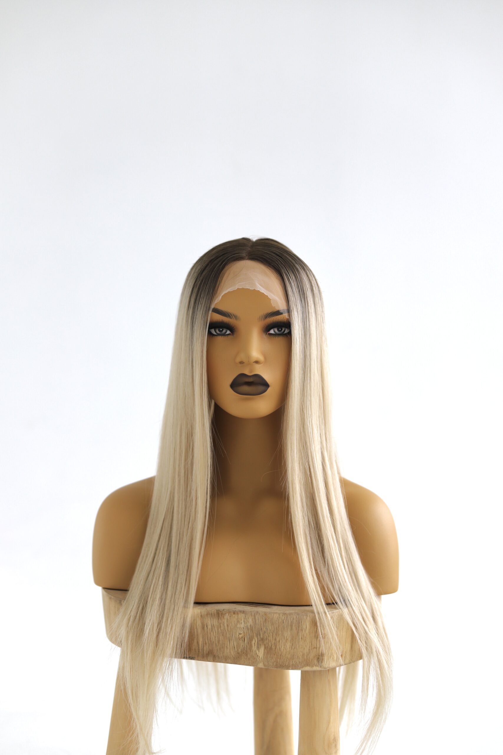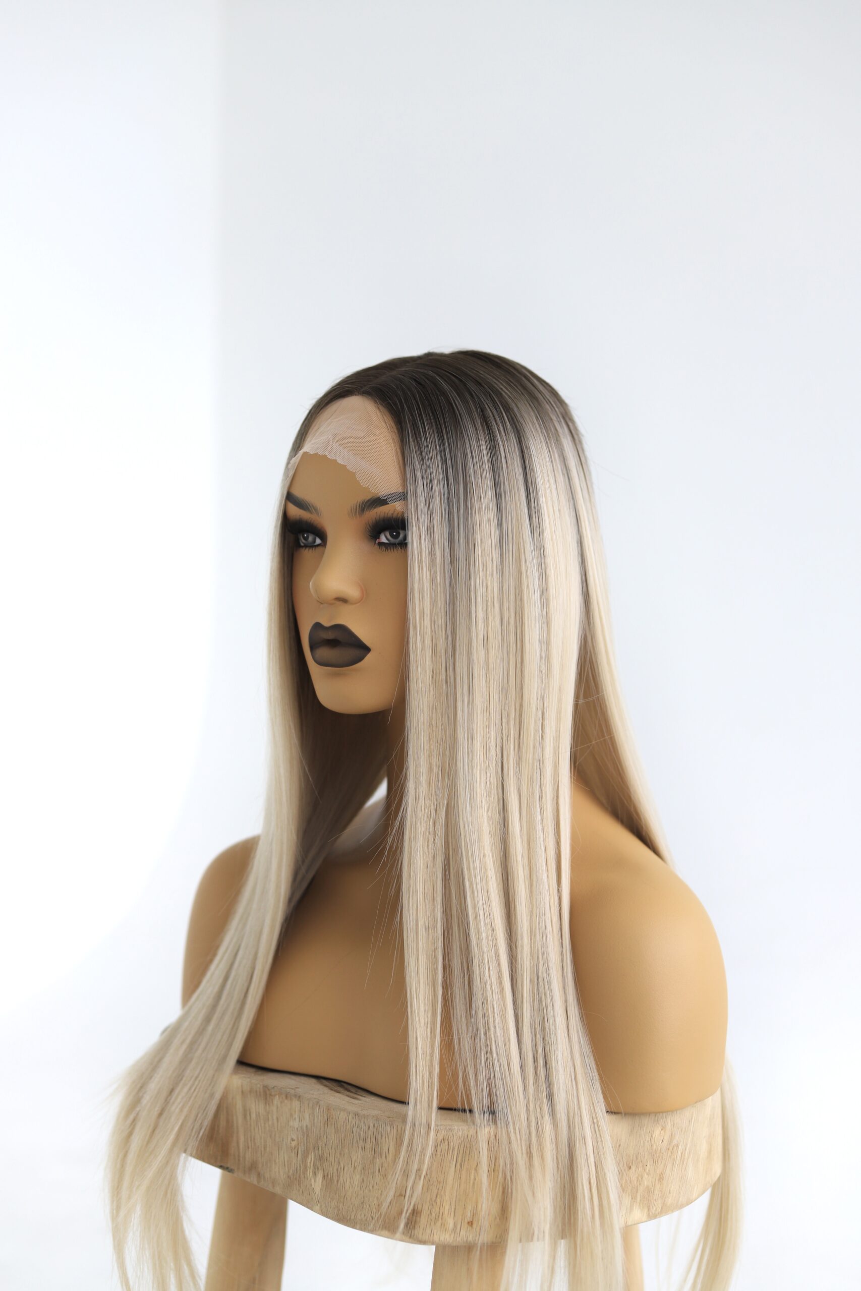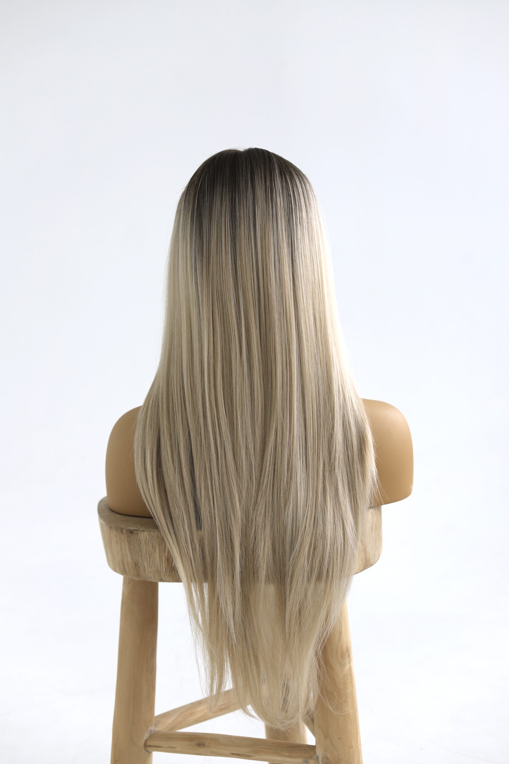 Peruka Lace Front Blond z Odrostem – długa do pasa, z chłodnym brązowym odrostem.