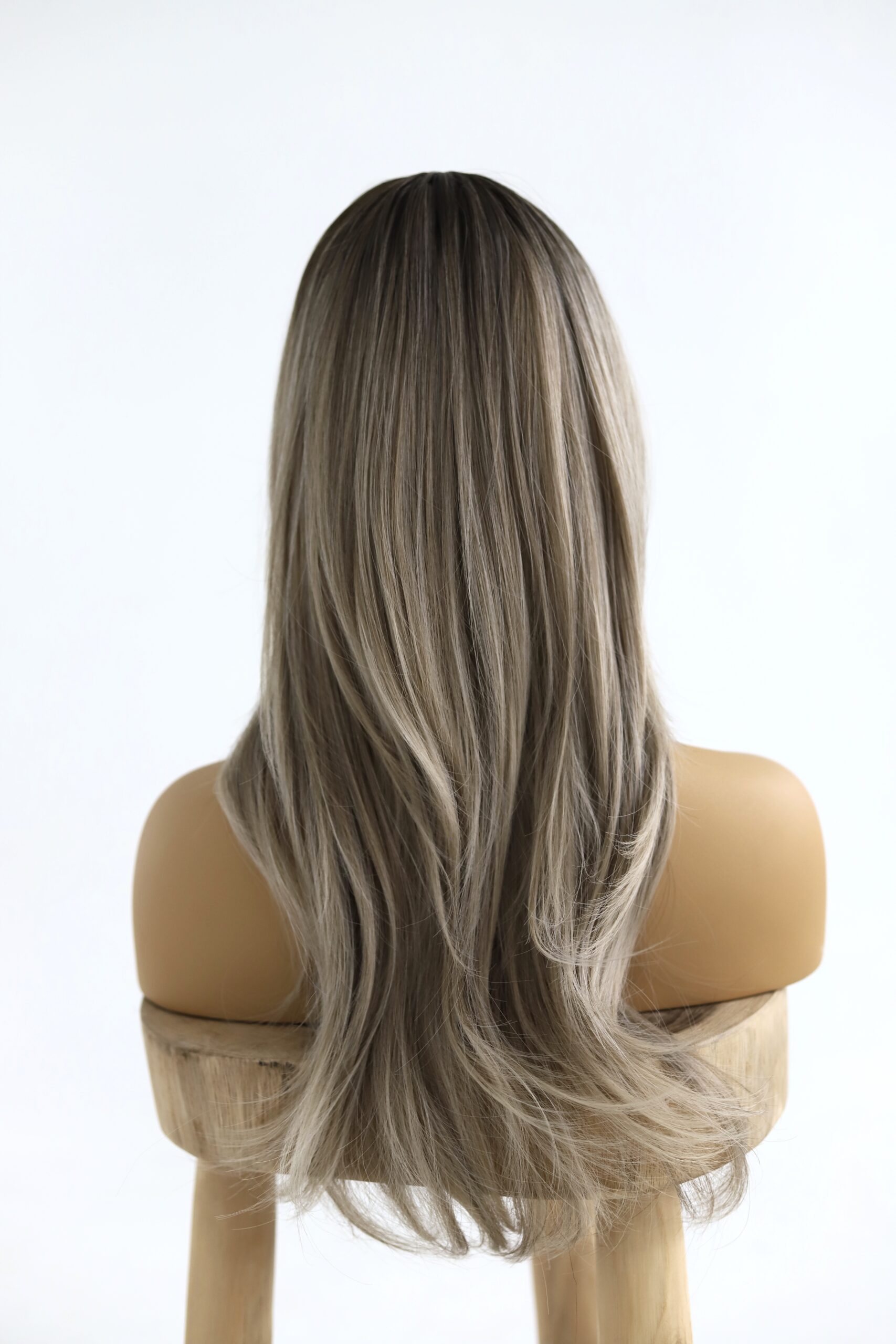 Blond Peruka z Długa Grzywką w odcieniu popielaty blond z odrostem.